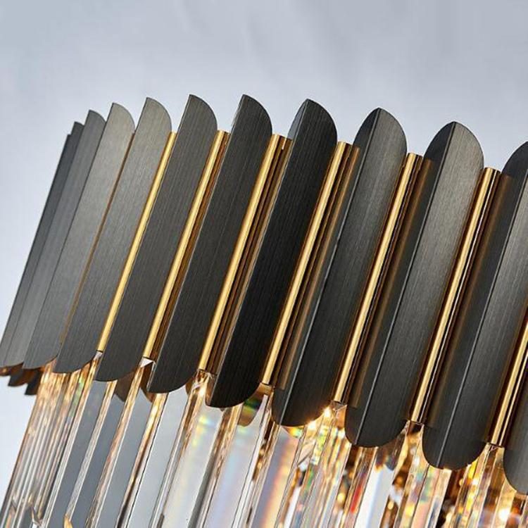 This incredible piece commands the attention of everyone who enters the room. A truly stylish modern crystal chandelier that fits perfectly in any space in your home. The color of the frame is very similar to gunmetal gray with gold inlay trim detail between the strips. |