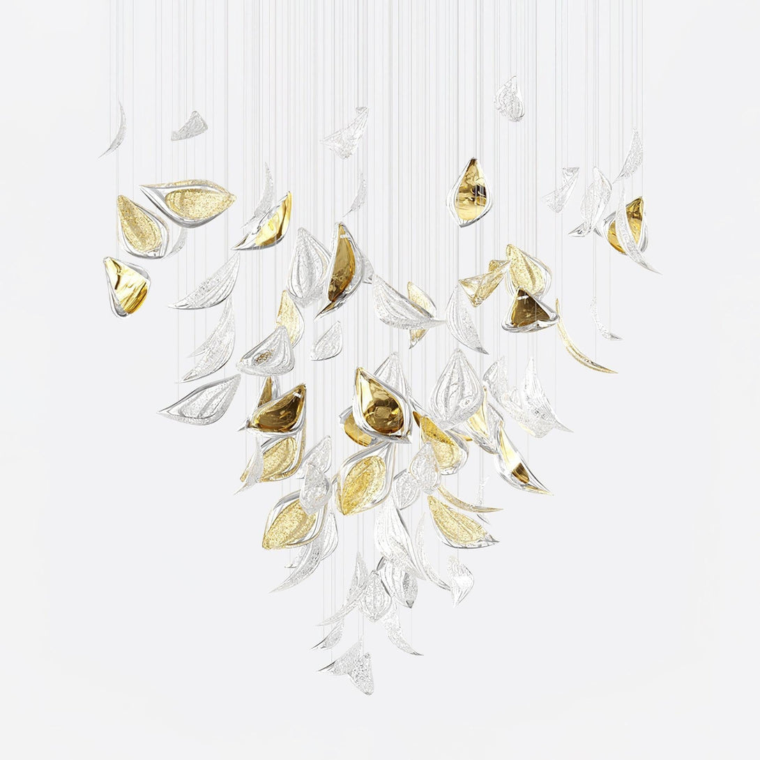 Experience the grandeur of our customizable Leaf Chandelier. Made of anodized gold aluminum, it radiates a warm glow upwards while casting intricate shadows. The integrated LED lights make the brushed finish shimmer in golden tones. With narrow spotlights on the ceiling, it's like walking through a sun-dappled forest.