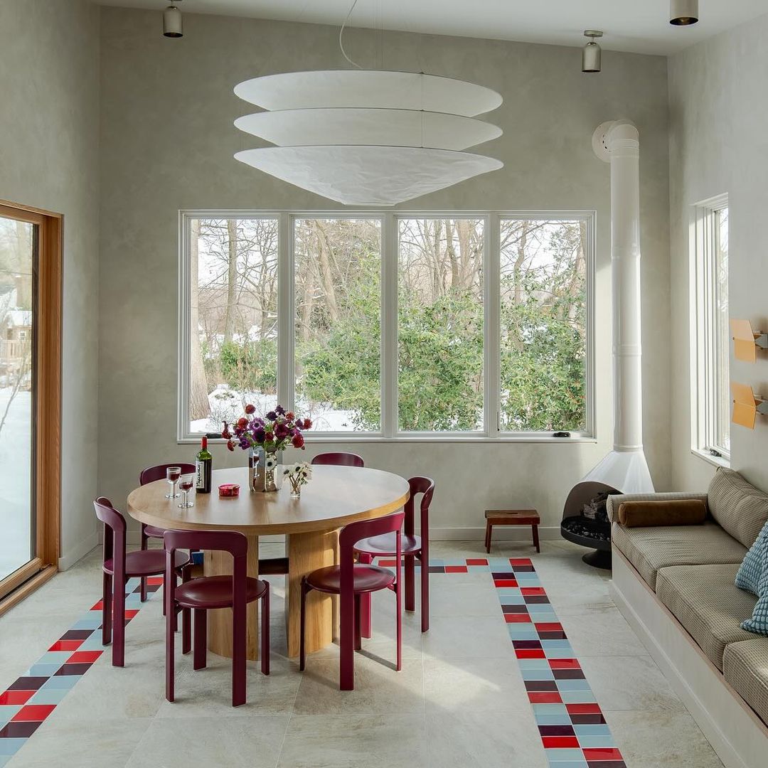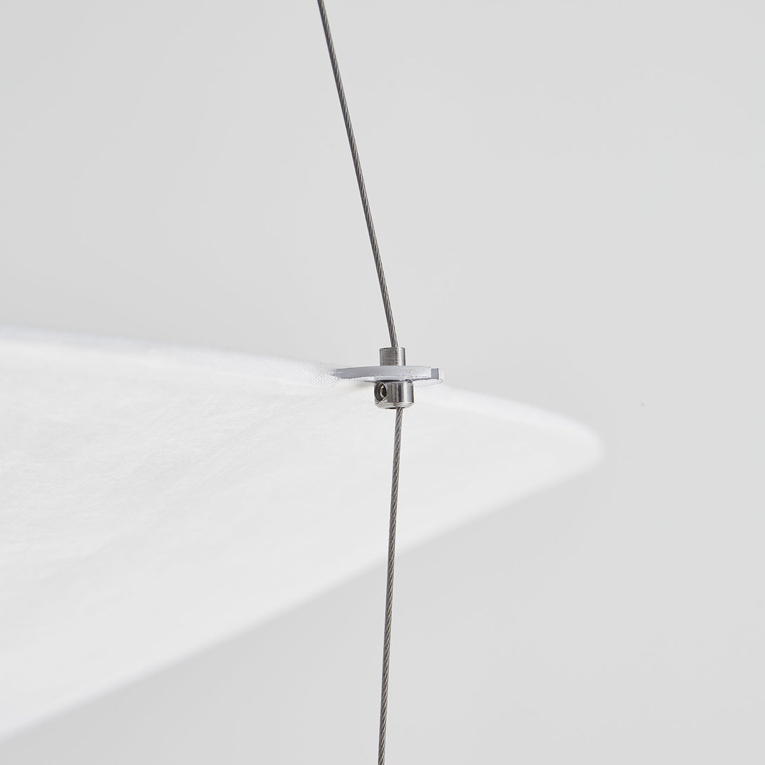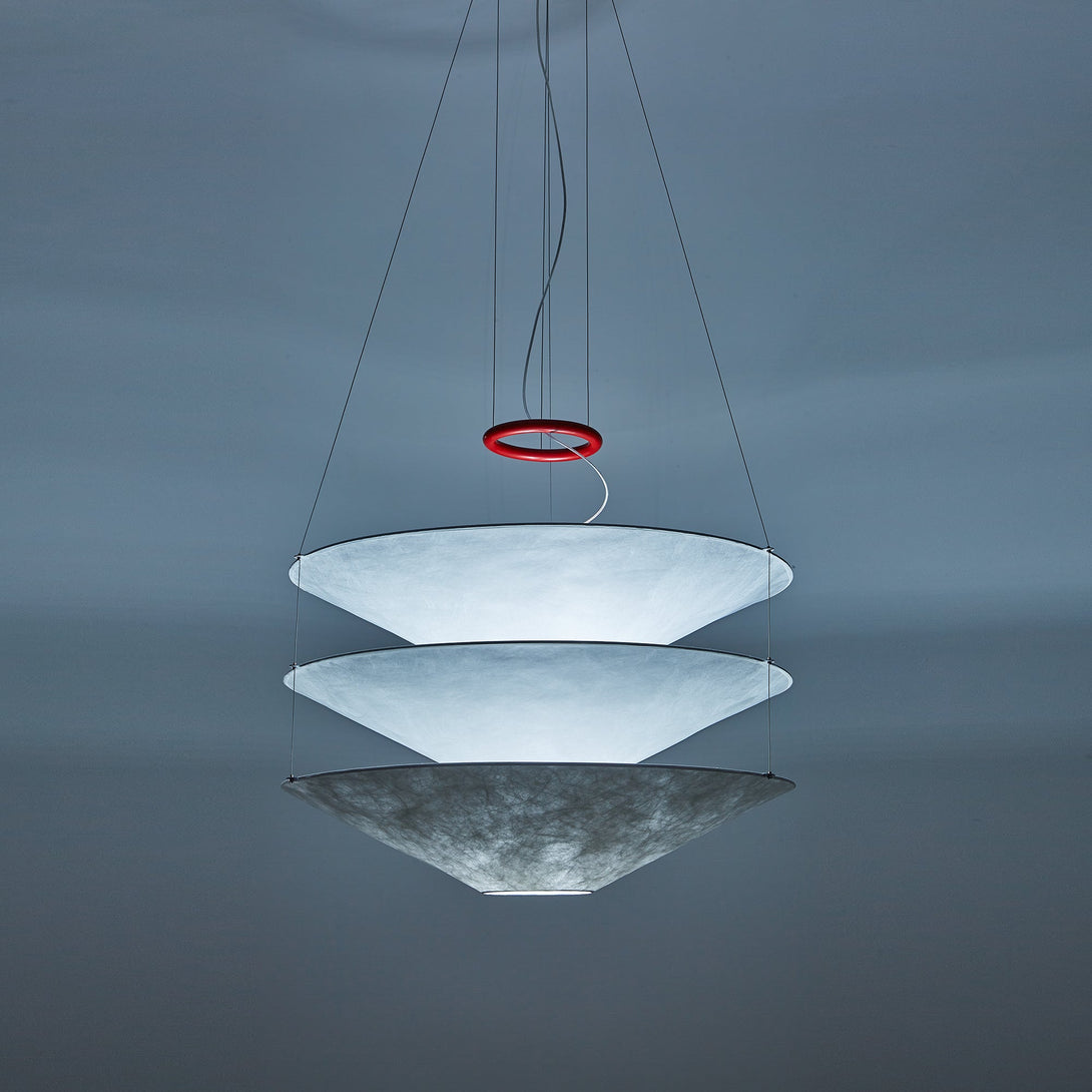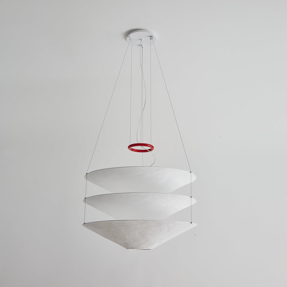 Illuminate your space with the Floating Pendant Light. Designed by designer in 1980, three handcrafted Dupont paper shades are suspended by delicate metal cables and a red iron ring adds an elegant accent, acting as a counterweight for adjustable height. Its crinkled paper is a unique design feature that responds to changes in humidity, creating the perfect eye-catching accent.