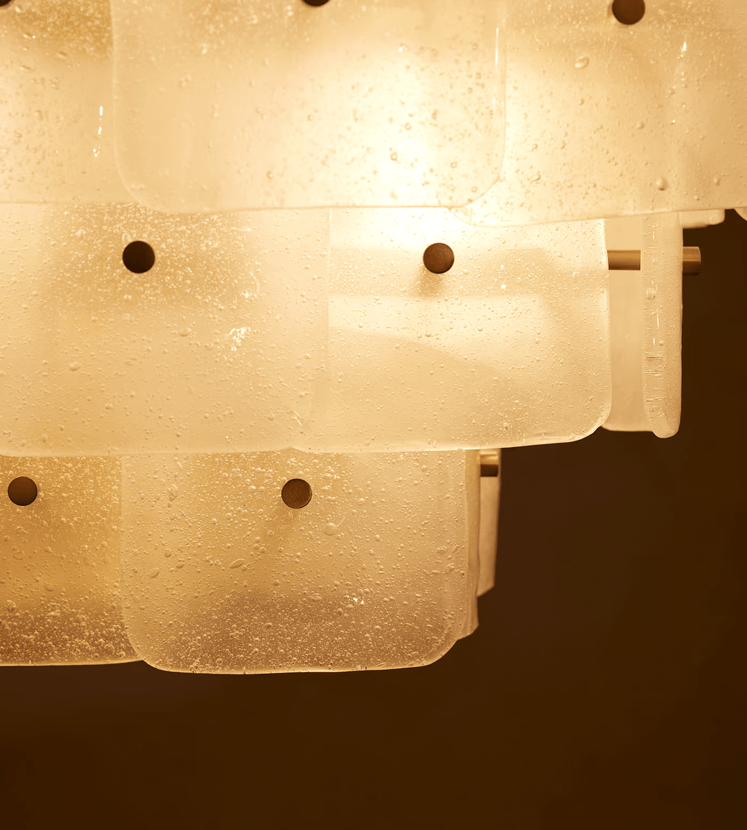 The Francis Chandelier features a geometric silhouette formed by tiered, curved pieces of white-frosted bubbled glass. Drawing inspiration from the tiered chandeliers of Barcelona, each glass layer is meticulously arranged to create depth and texture. Suspended from an adjustable pole, its frame is finished with antiqued brass plating, blending classic elegance with modern adaptability to enhance any interior space.
