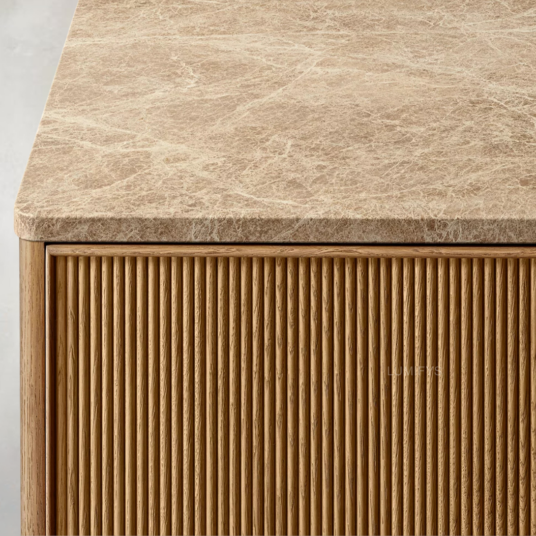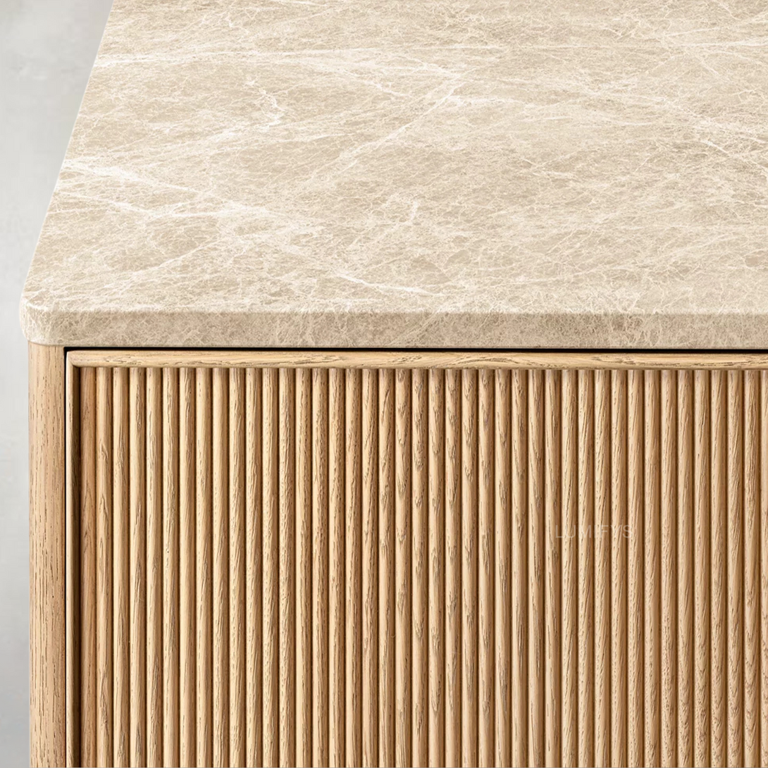 - Door fronts feature solid European white oak reeding