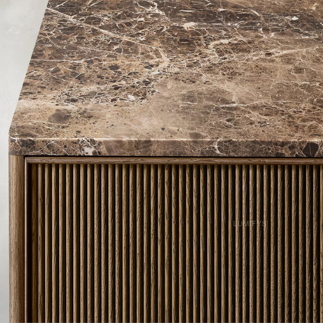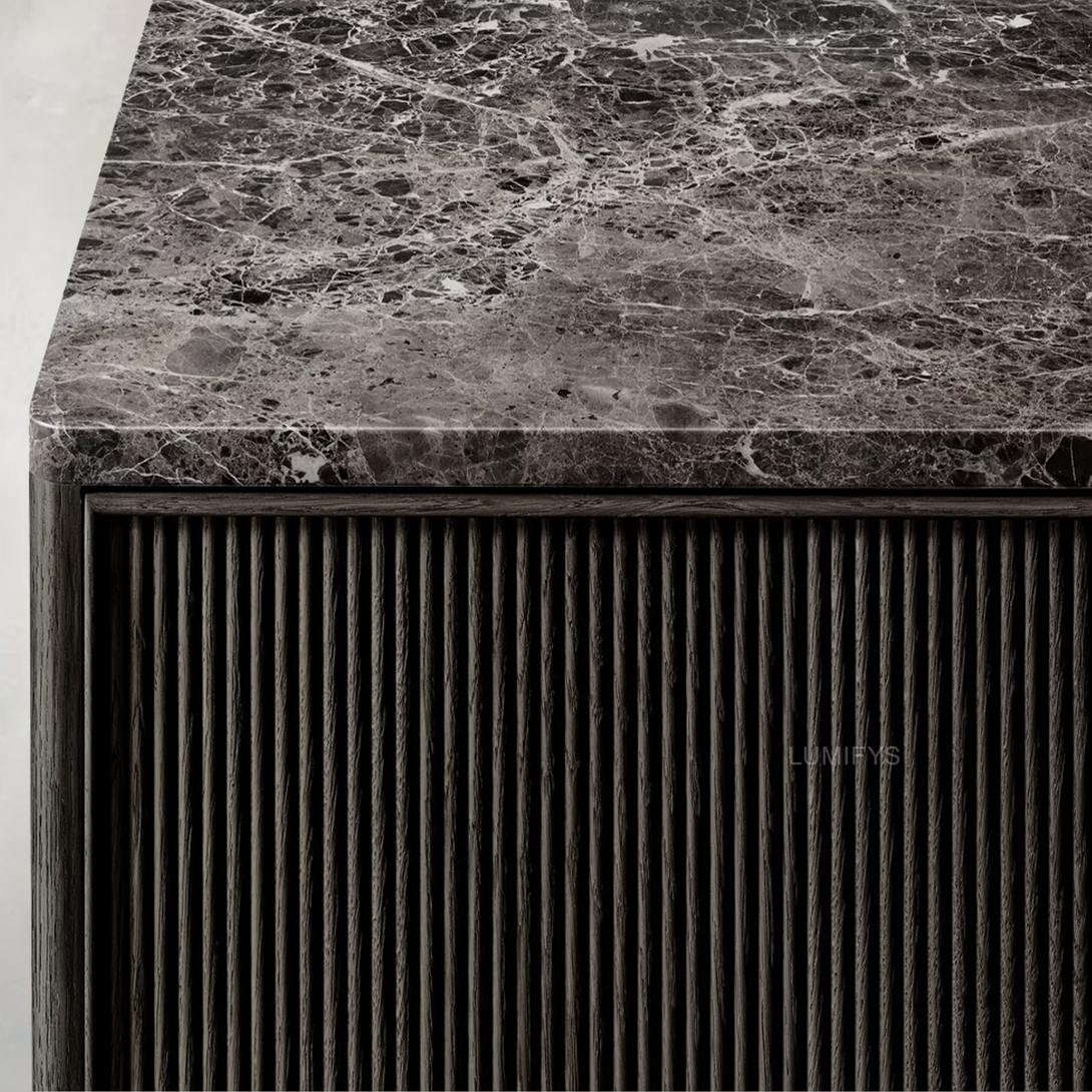 - Top crafted of ⅛"-thick Spanish or Turkish marble over an engineered wood core