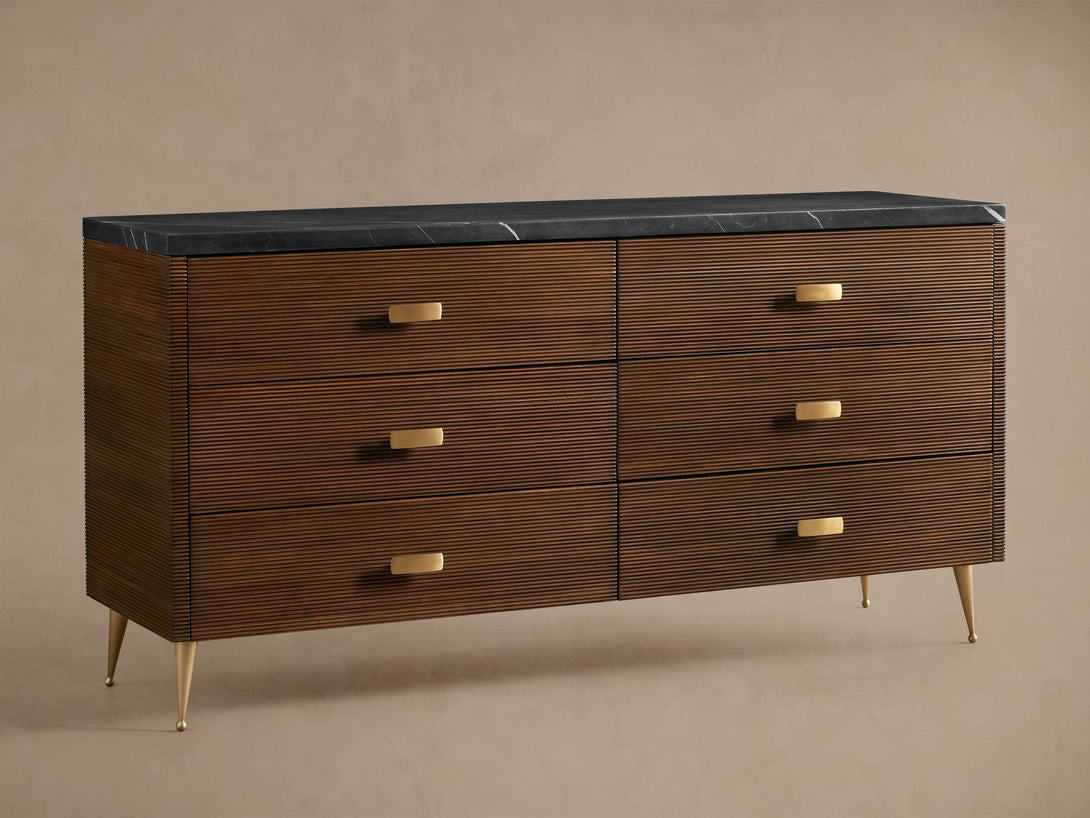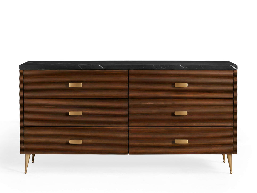 - Dressers and nightstands feature black Marquina veneer tops, brass legs, and brass drawer pulls.