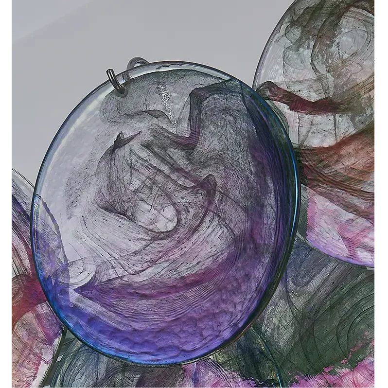 Hand-blown iridescent glass discs with aqua-lavender veining
