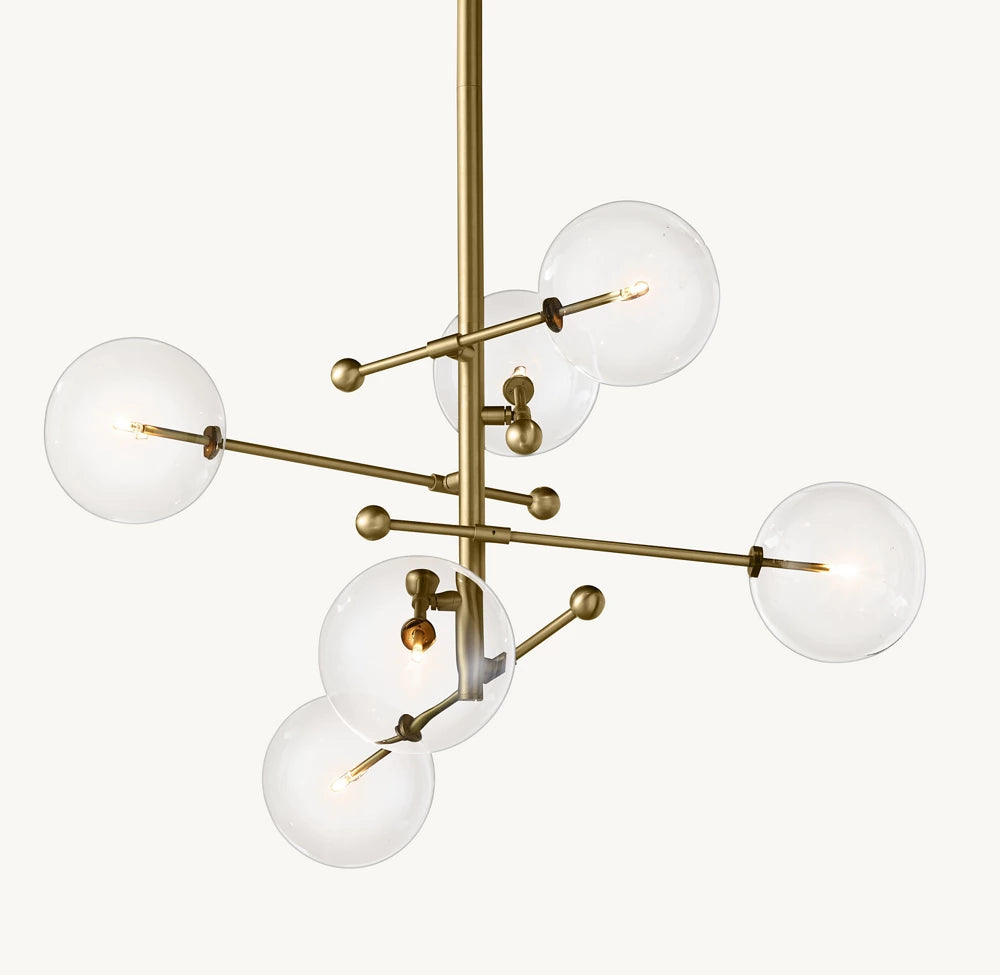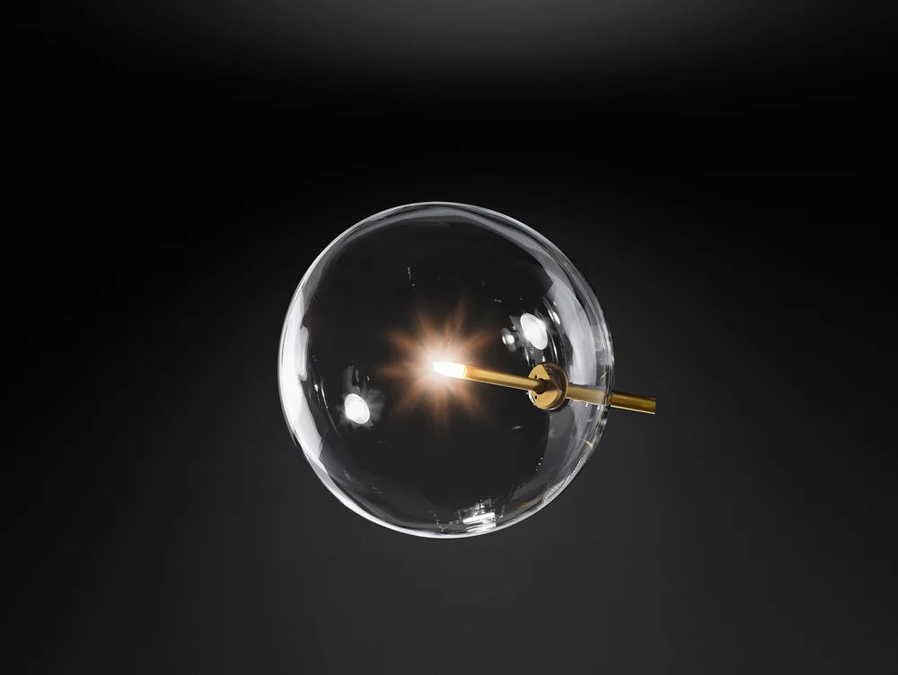 Delicate, handblown glass globes float at the ends of solid brass rods in our collection by designers Rudi Nijssen and Dominique Sente. Crafted in Poland by master glassmakers, each fixture conveys fluidity and motion yet is anchored in the pure modern architecture of its form.