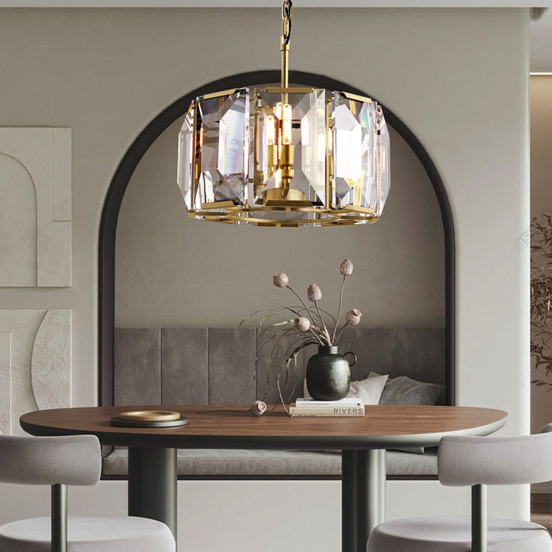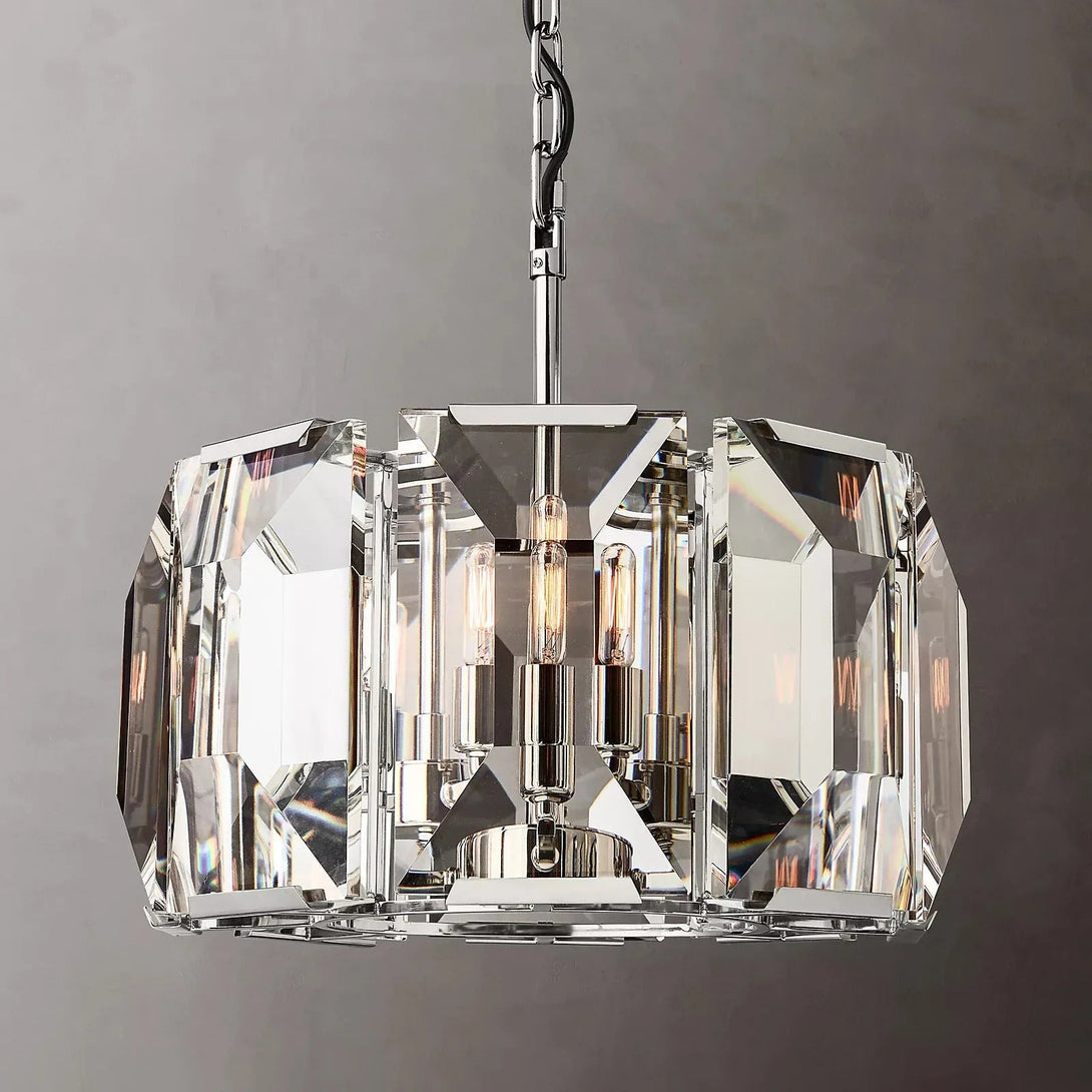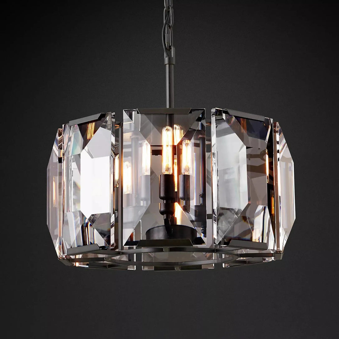 This chandelier is composed of an iron frame with spaced rectangular crystal glass prismatic bands, secured at the top and bottom with bold metal brackets. Our fixture evokes the boldness and glamour of the 1970s. A circle of faceted crystal glass prisms reflect and refract light, capturing the essence of emerald-cut diamonds. Bright light shimmers through the glass refracting on the walls and floor.