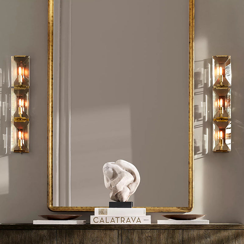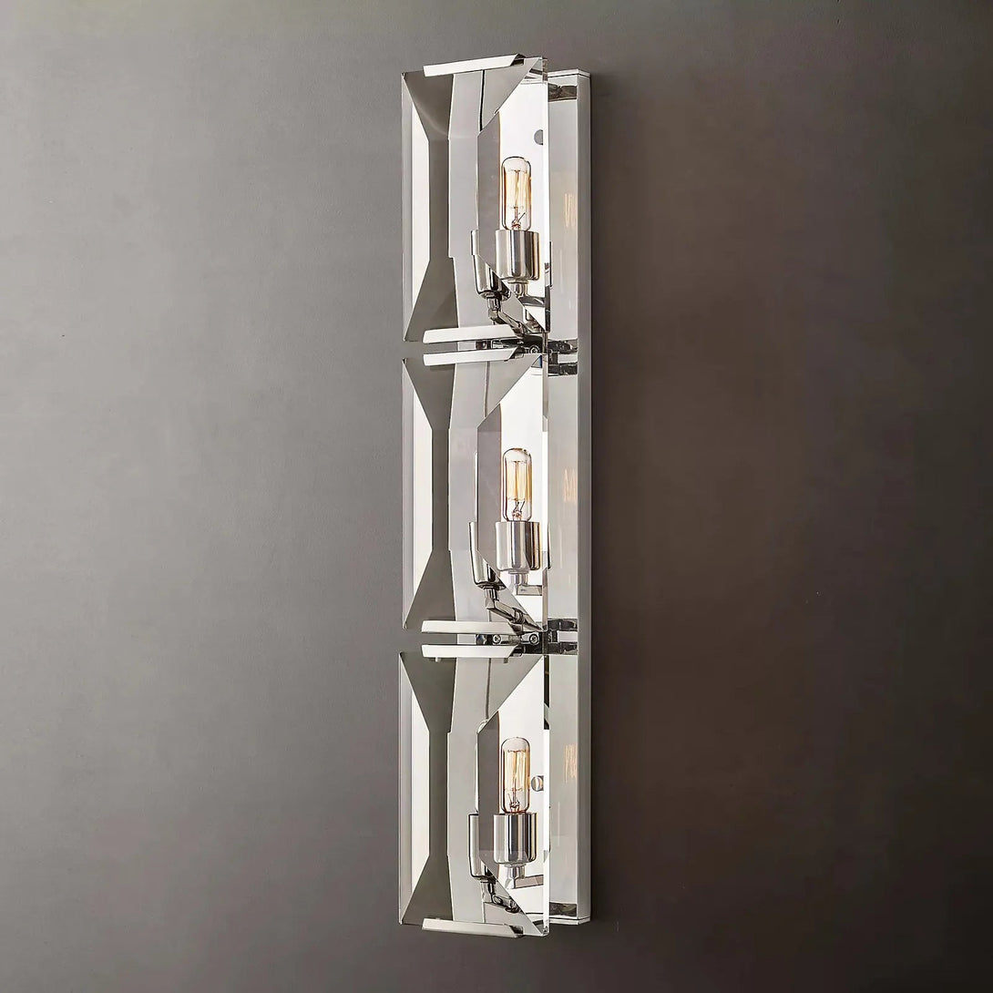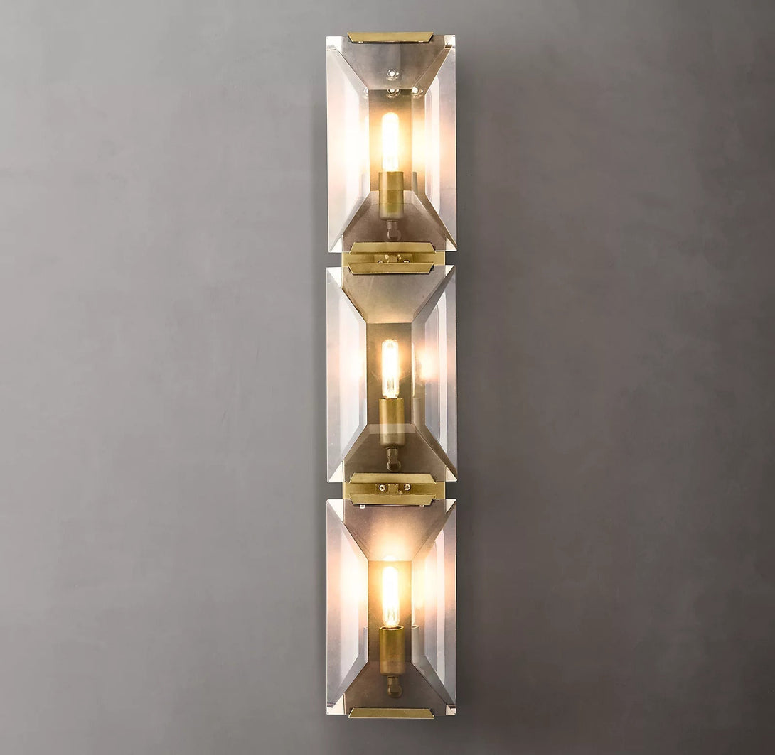 This Wall Sconce evoke the boldness and glamour of 20th century German inspired chandeliers. A circle of faceted crystal glass prisms reflect and refract light, capturing the essence of an emerald-cut diamond. The light shimmers through the crystal glass.