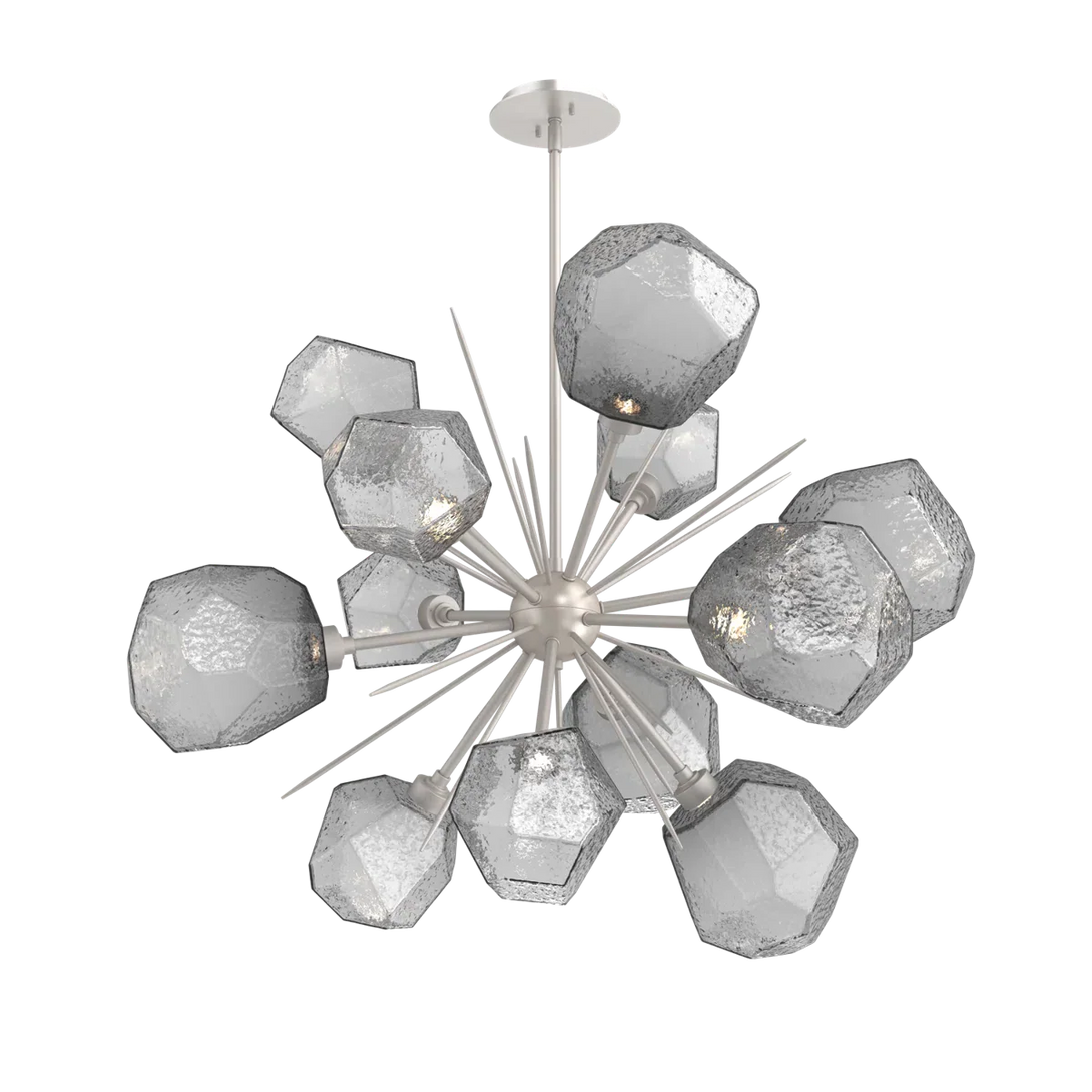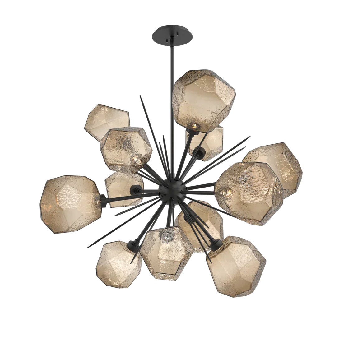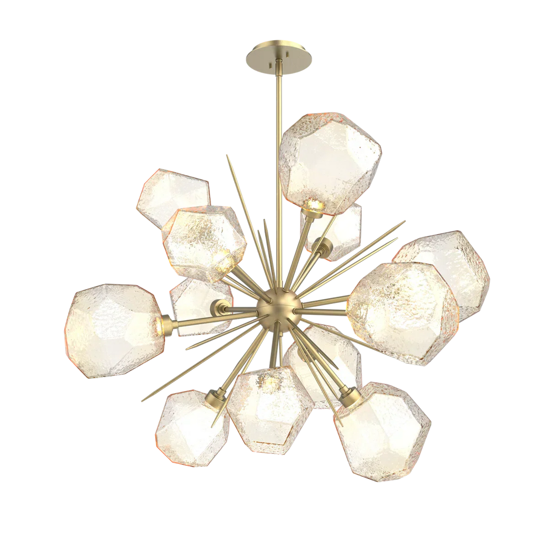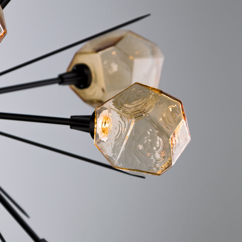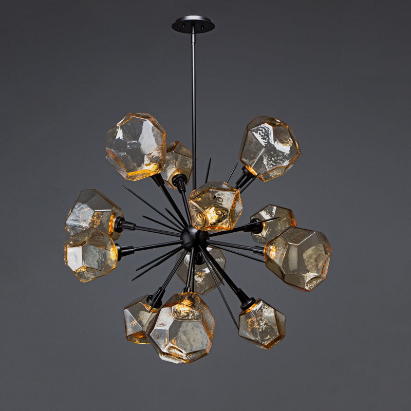 Illuminate your space with this dazzling chandelier, featuring sparkling LED-lit "gems" of hand-blown glass, each meticulously crafted by Hammerton artisans. Its unique starburst design adds a playful yet sophisticated touch, casting a beautiful glow that transforms any room into a wonderland. This dimmable fixture offers adjustable height and is sloped ceiling compatible, making it a versatile and enchanting addition to your home.