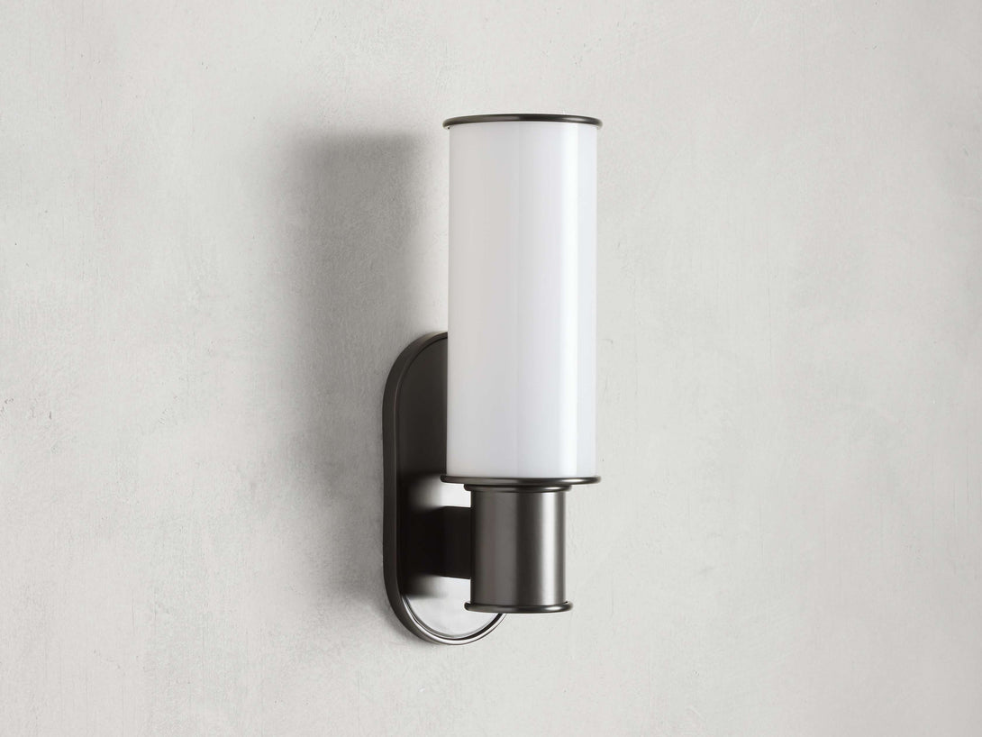 - Harlin is an Arhaus exclusive lighting collection crafted from steel and brass with a polished nickel, bronze plated, or burnished brass finish with a milk glass cloche to complement your bathroom aesthetic.