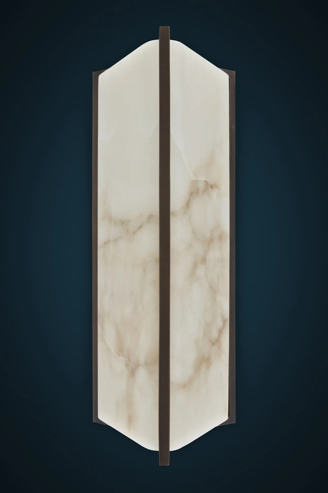 The wall sconce blends refined bronze craftsmanship with the natural beauty of alabaster stone. Each fixture emits a soft, warm glow through hand-carved alabaster, complemented by timeless patina finishes. Available in three sizes to suit residential and commercial interiors.