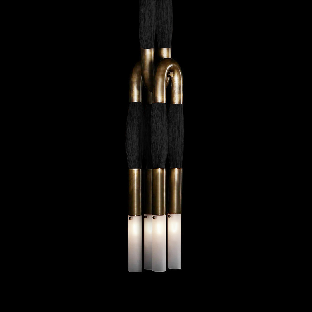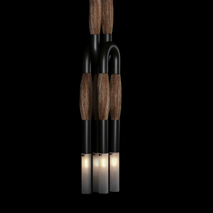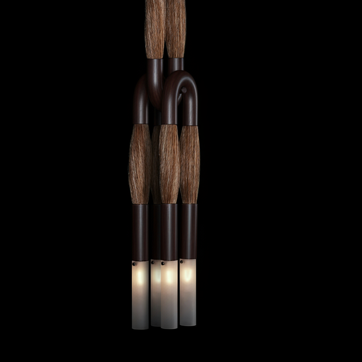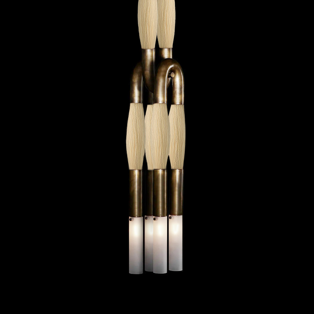 A thorough study of materials evokes the elegance and strength of the tassel. The weft of the tassel, combined with metal and etched glass, hints at the structural and load-bearing function of the thick thread.
