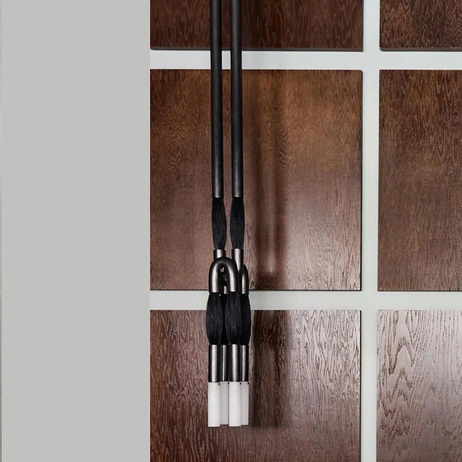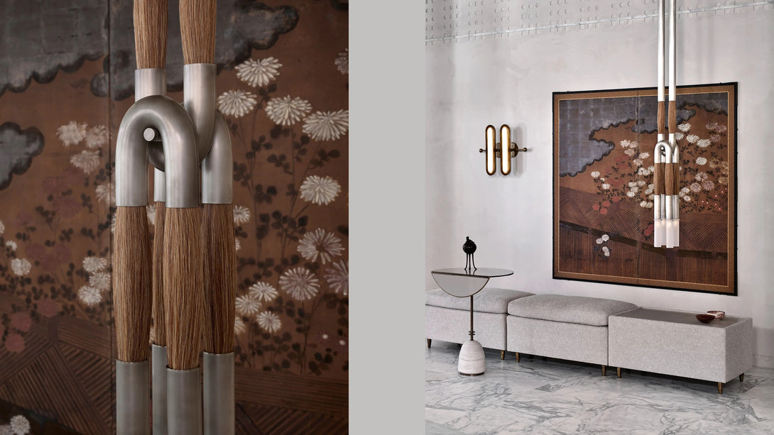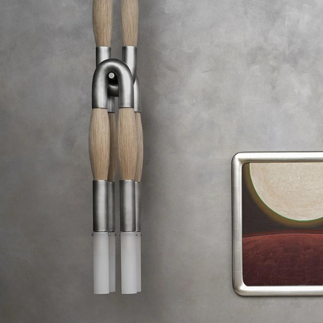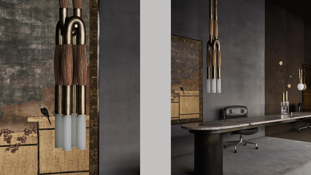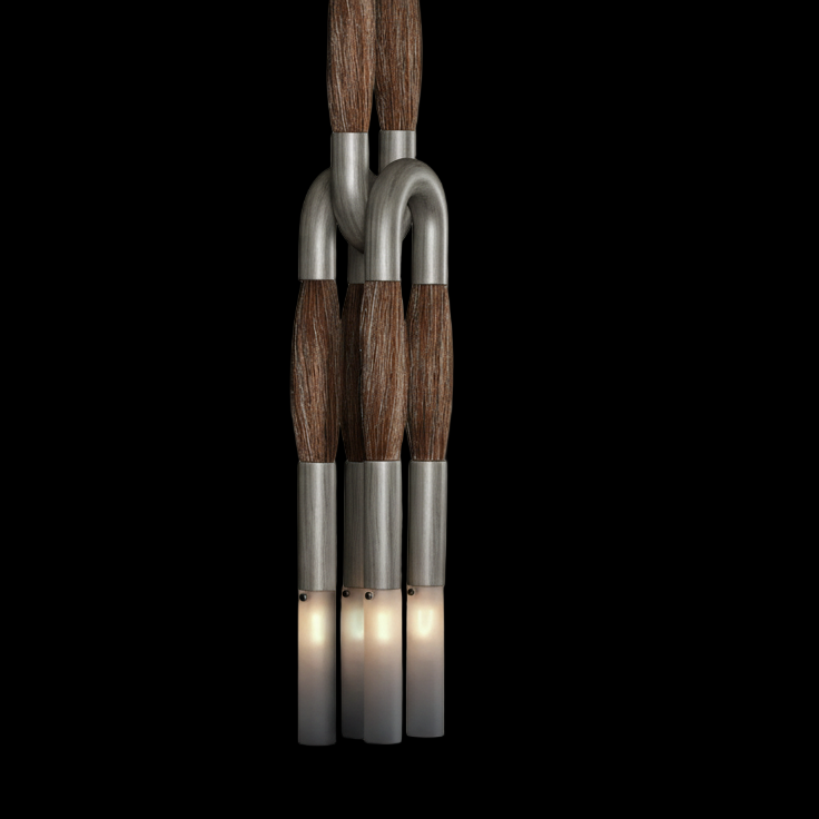 A thorough study of materials evokes the elegance and strength of the tassel. The weft of the tassel, combined with metal and etched glass, hints at the structural and load-bearing function of the thick thread.