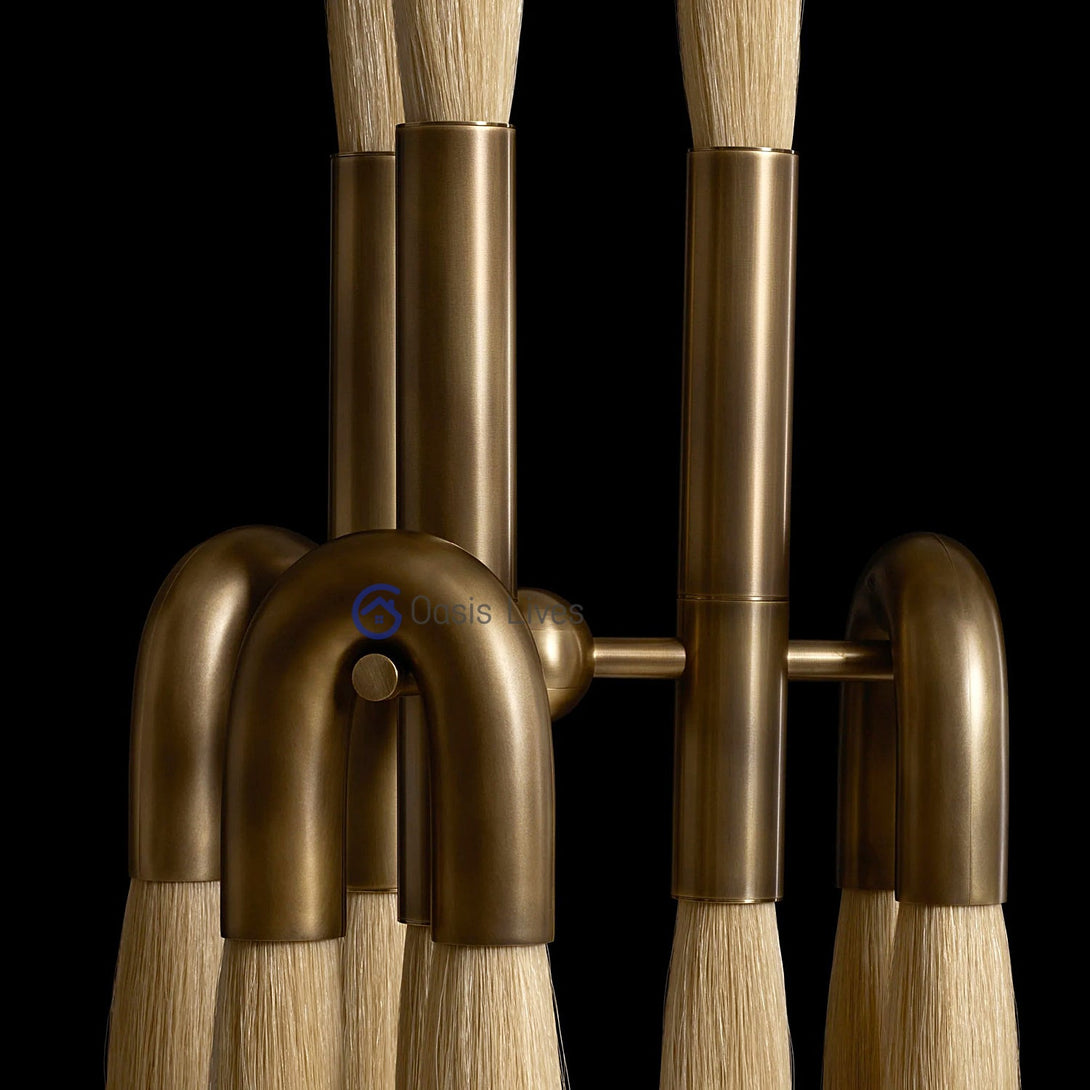 This Heritage Horsehair 9-Light Pendant Lamp combines horsehair, brass, and etched glass for a unique design and exquisite materials. The warp of the horsehair combines with the brass body of the lamp to create a visual effect that is both sturdy and elegant.