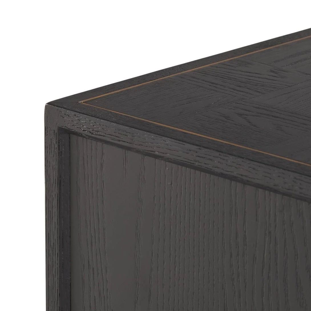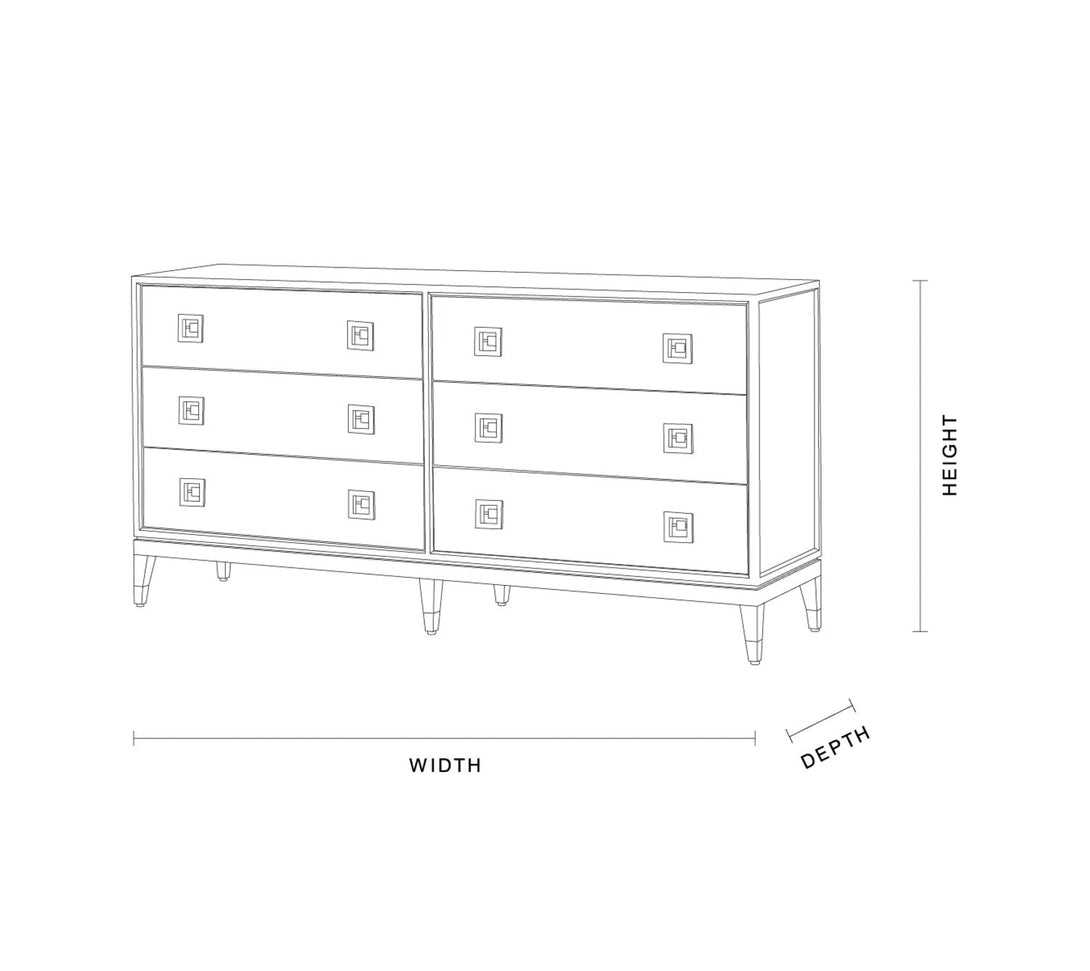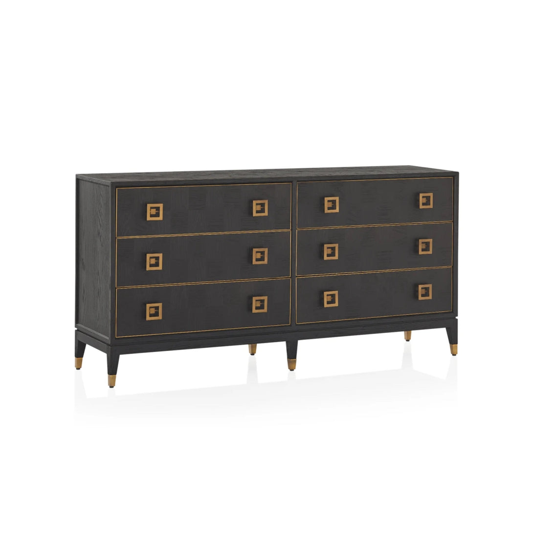 A sophisticated dresser featuring square timber paneling with metal accents.|A classic design for the sophisticated home the Hermitage Dresser boasts hand-crafted blackened oak square paneling inlaid with brass to offer a subtle hint of luxury set atop elegantly tapered legs. Curated for the sophisticated home inspired by Parisian-styled interiors. Handcrafted from timber with elegant metal accents the colour palette lends a refined modern edge to classic forms. Featuring six deep draws this dresser has abundant storage.