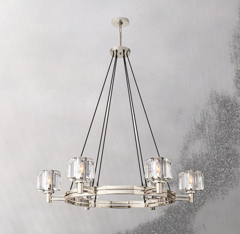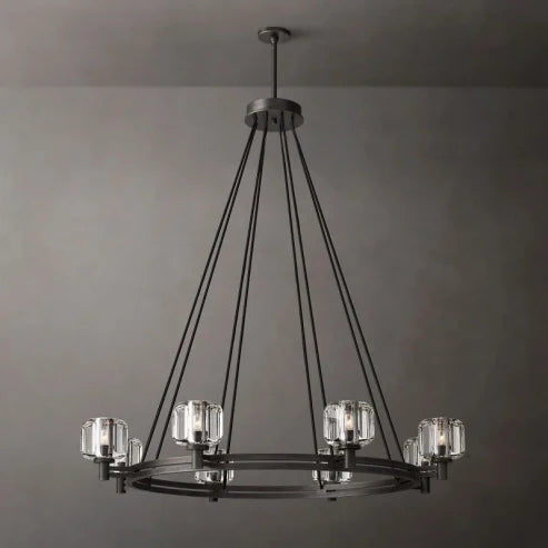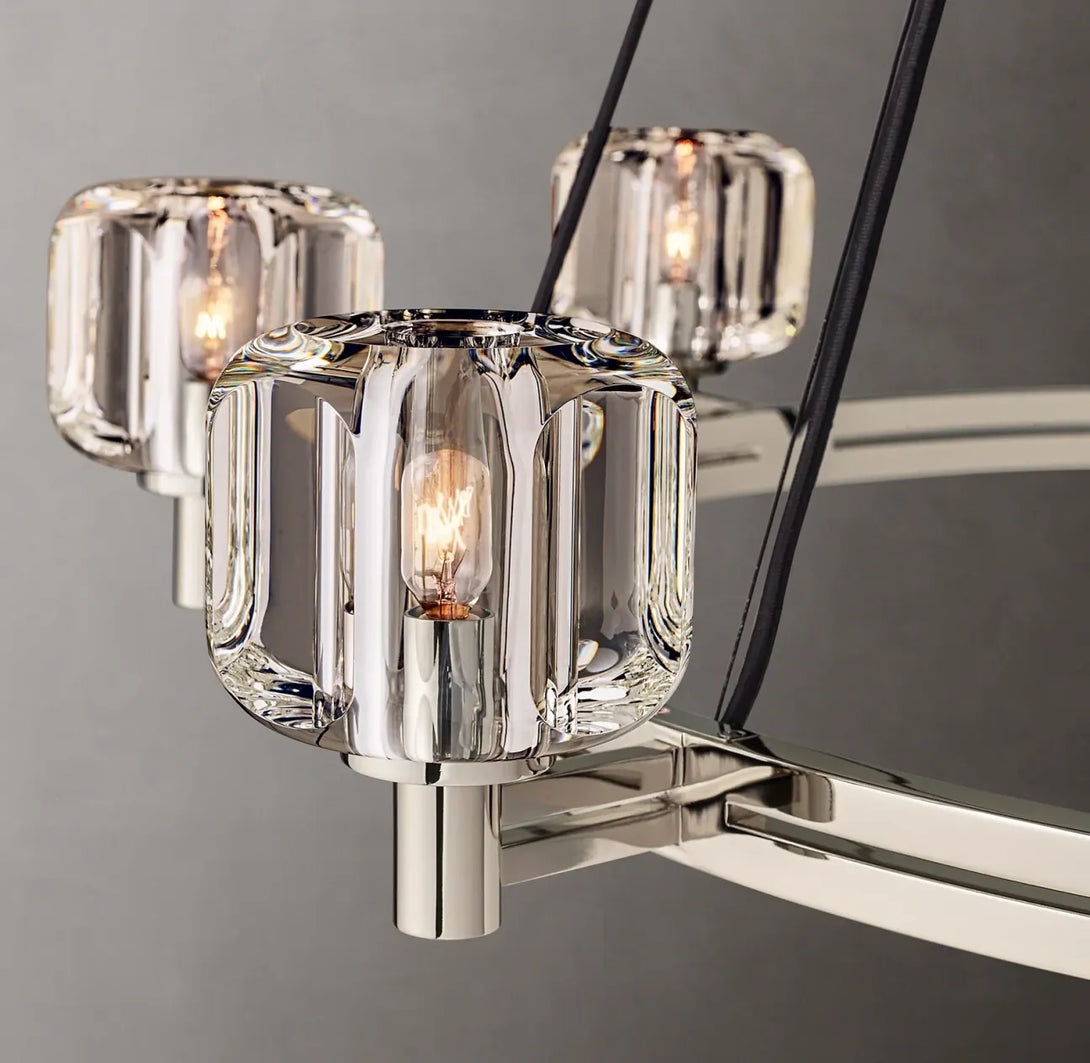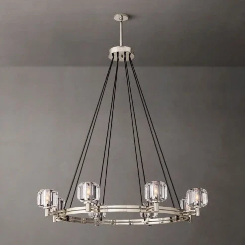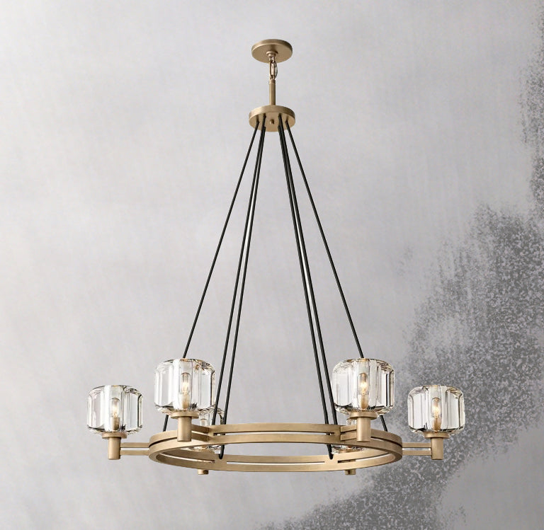 The Demaret Vintage Round Chandelier 48" exudes timeless elegance. Its bimetallic frame showcases beautifully curved surfaces crafted from K-9 cast crystal. Meticulously hand-polished, this chandelier reflects and refracts light with exceptional brilliance. The smooth oval facets add a touch of sophistication while allowing a clear view through the crystal. Elevate your space with this effortlessly sophisticated centerpiece.