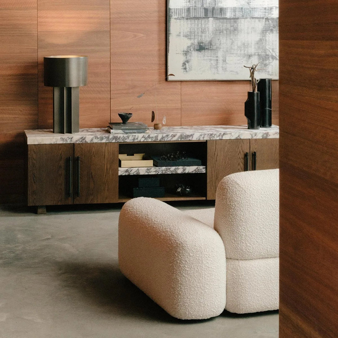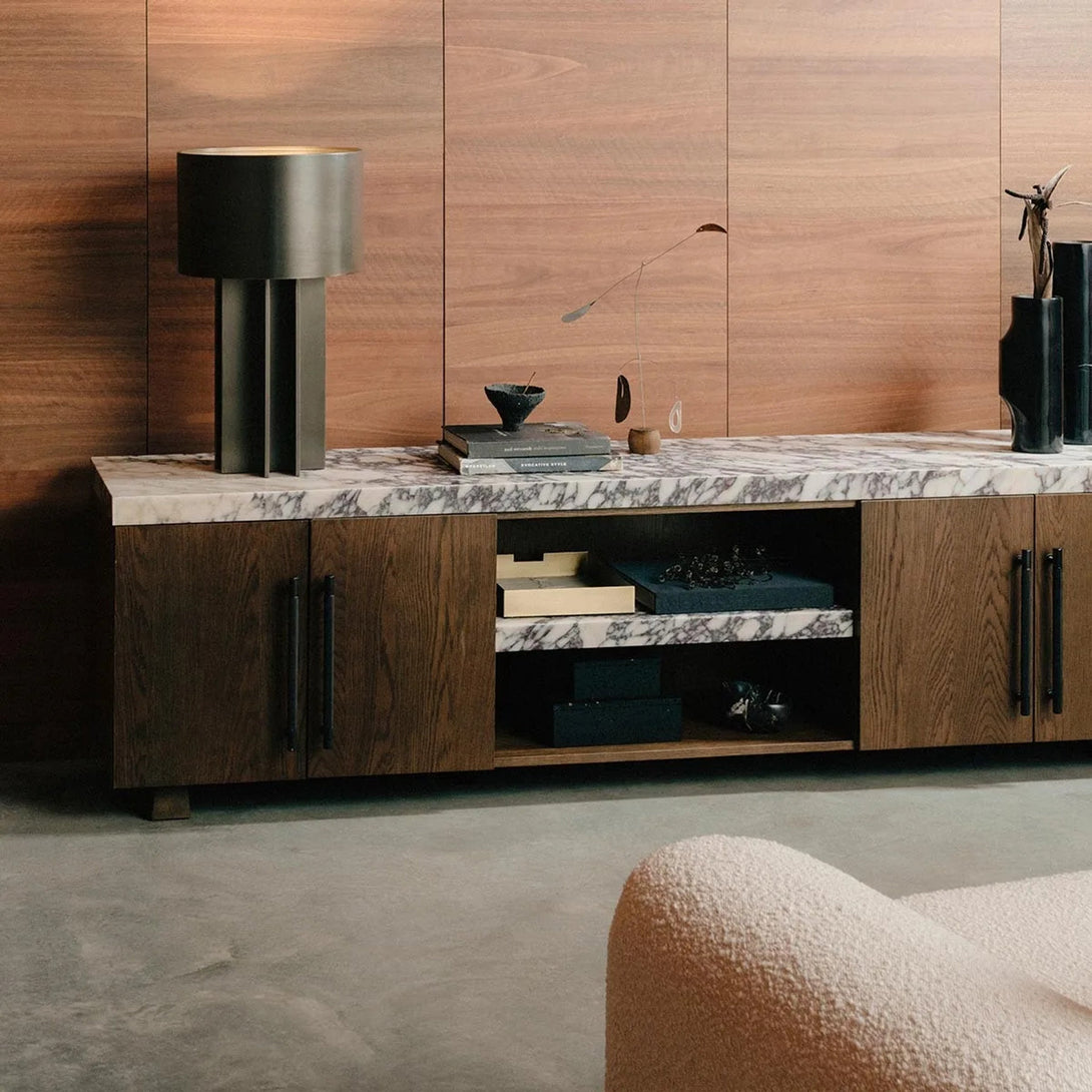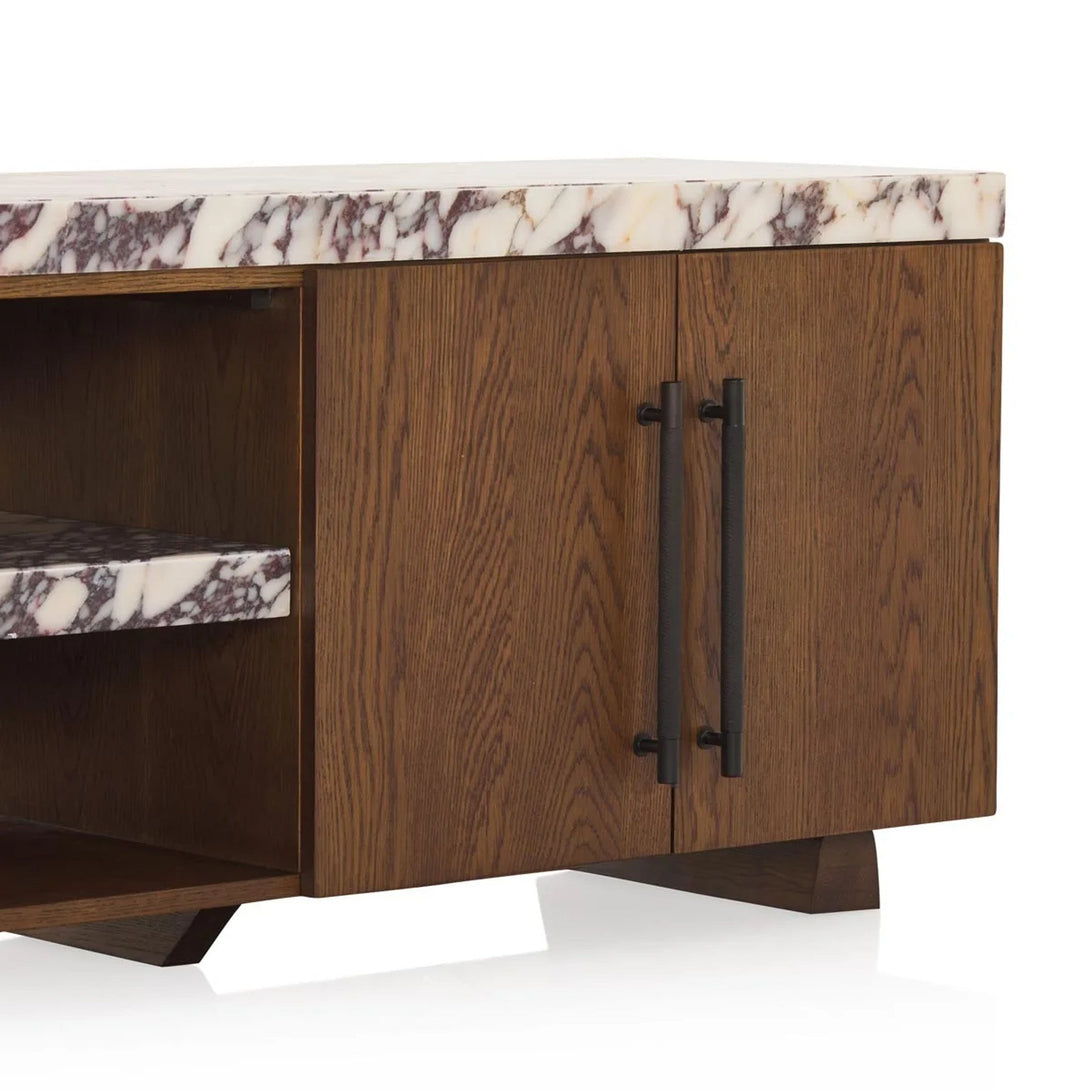 An impressive entertainment unit certain to make a lasting impression.|Crafted to serve as an alluring centrepiece the Khodier Entertainment Unit stands out for its exquisite aesthetics boasting a Calacatta Viola marble top and shelf elegantly upheld by a frame crafted from plywood with an oak veneer finish. The handles are crafted from bronze-finished stainless steel. The fusion of marble and oak veneer captures the essence of natural beauty. As marble is a natural material the variations in veining colours are to be expected as standard.