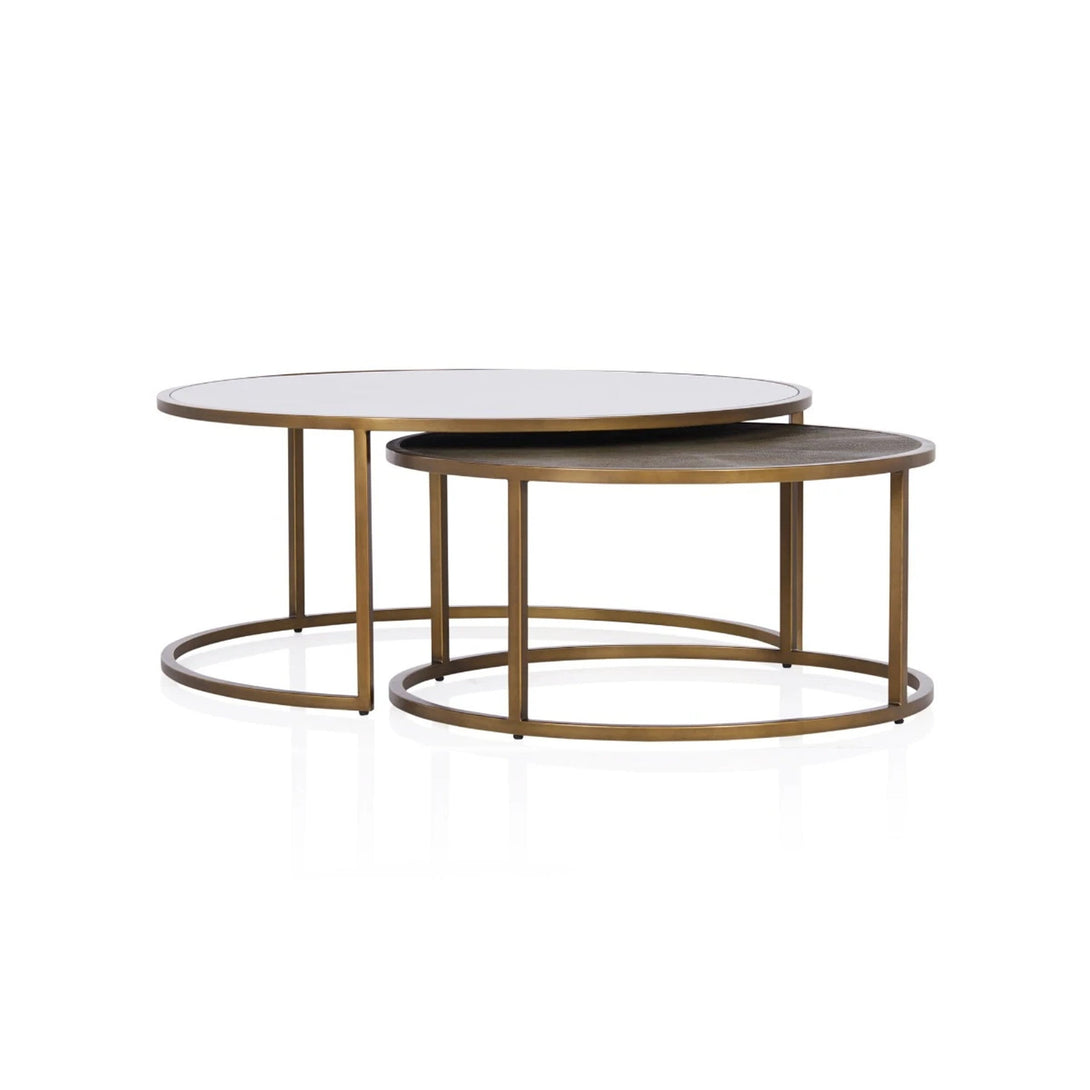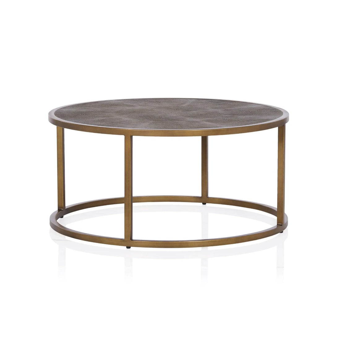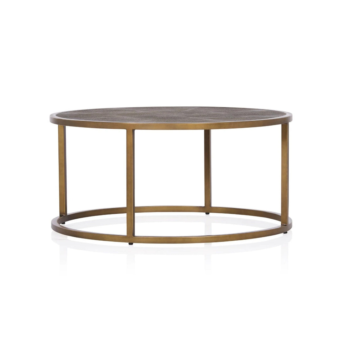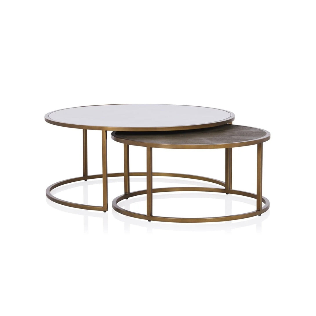 Sophisticated desk for the refined interior finished in a luxe combination of faux shagreen and polished stainless steel.|The perfect piece for adding a touch of glamour and function to your living room the Knox Nesting Coffee Table is ideally proportioned. The open design and reflective persona celebrate luxe materials. Featuring a diminutive metal frame with slender silhouette finished in antique brass accented by antiqued mirror and faux shagreen it is sure to amp the glam factor in any room. Sold together as a pair.