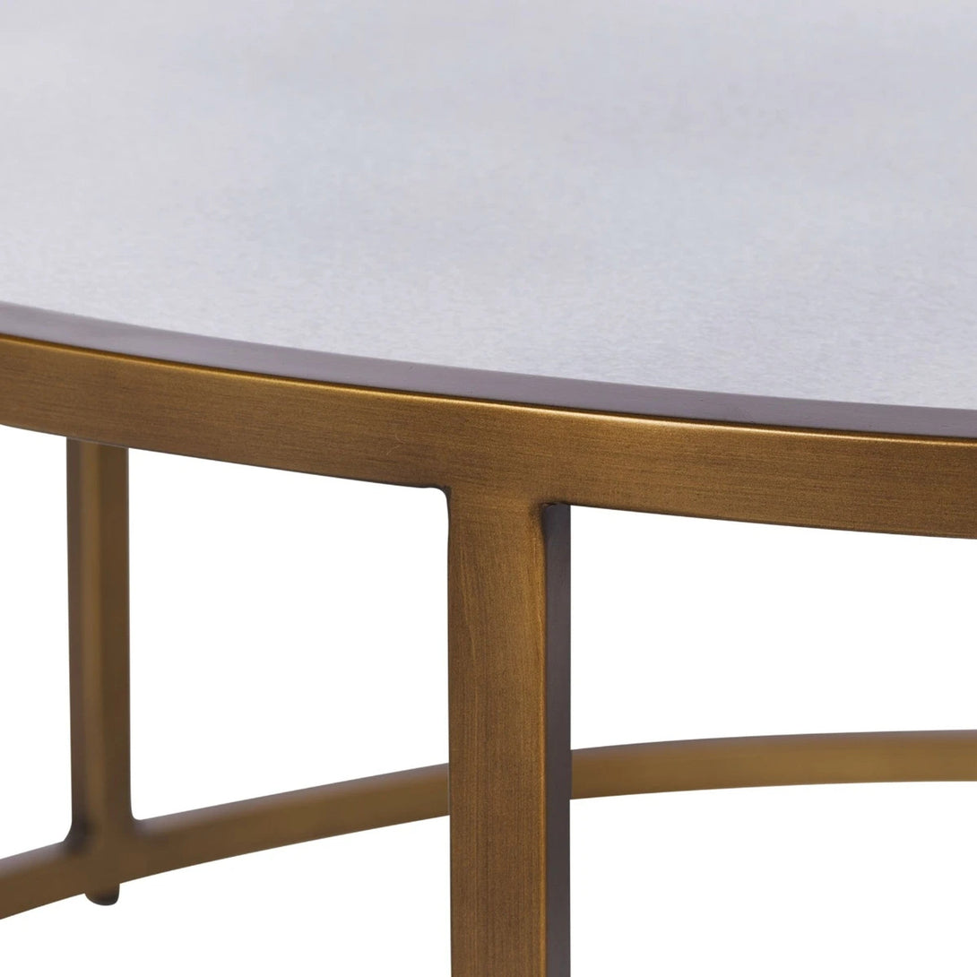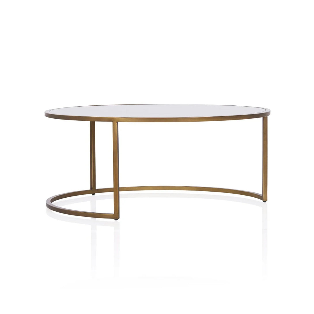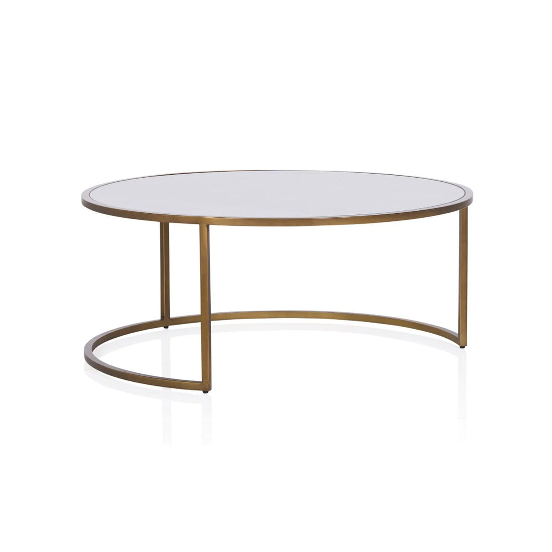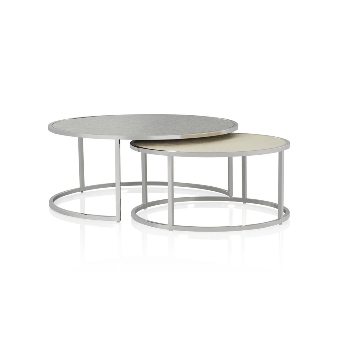 Sophisticated desk for the refined interior finished in a luxe combination of faux shagreen and polished stainless steel.|The perfect piece for adding a touch of glamour and function to your living room the Knox Nesting Coffee Table is ideally proportioned. The open design and reflective persona celebrate luxe materials. Featuring a diminutive metal frame with slender silhouette finished in antique brass accented by antiqued mirror and faux shagreen it is sure to amp the glam factor in any room. Sold together as a pair.
