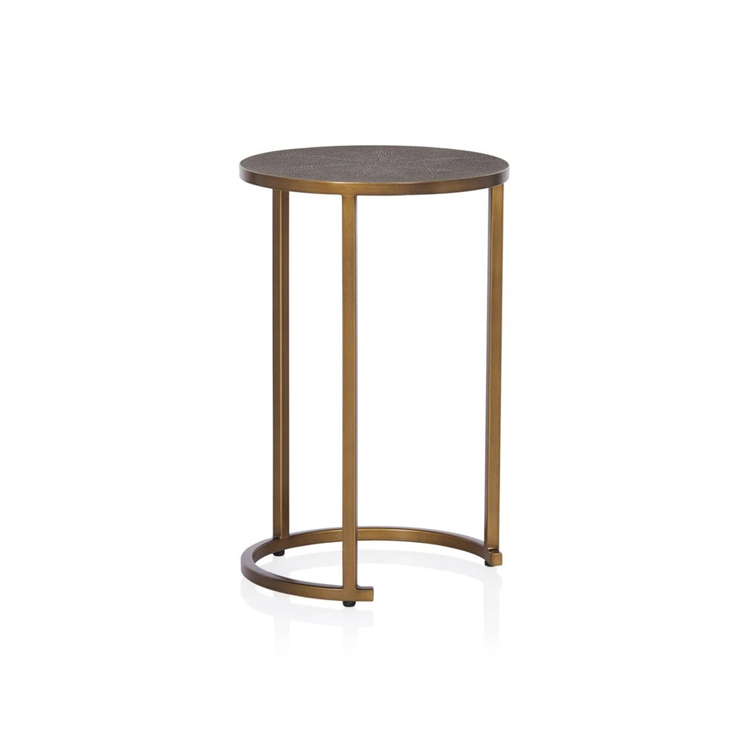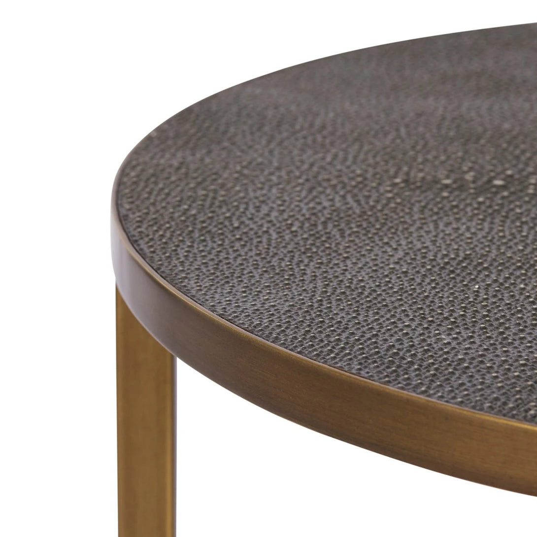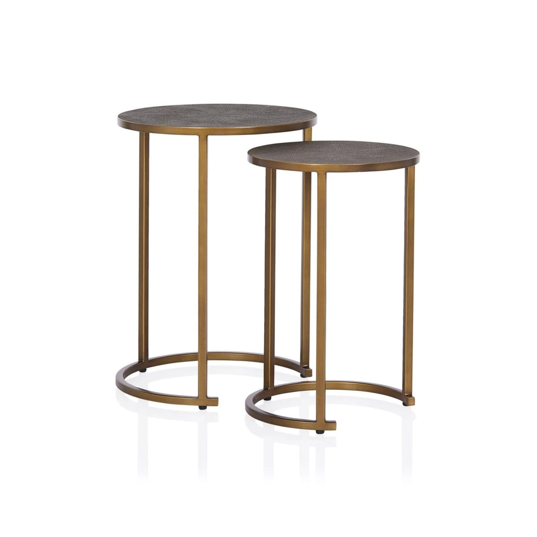 Sophisticated desk for the refined interior finished in a luxe combination of faux shagreen and polished stainless steel.|The Knox Nesting Side Tables are the perfect piece for adding a touch of glamour and function to your living room. The open and minimal design offer versatility while celebrating luxe materials. Featuring a diminutive metal frame with slender silhouette finished in antique brass accented by faux shagreen it is sure to amp the glam factor in any room. Sold together as a pair.