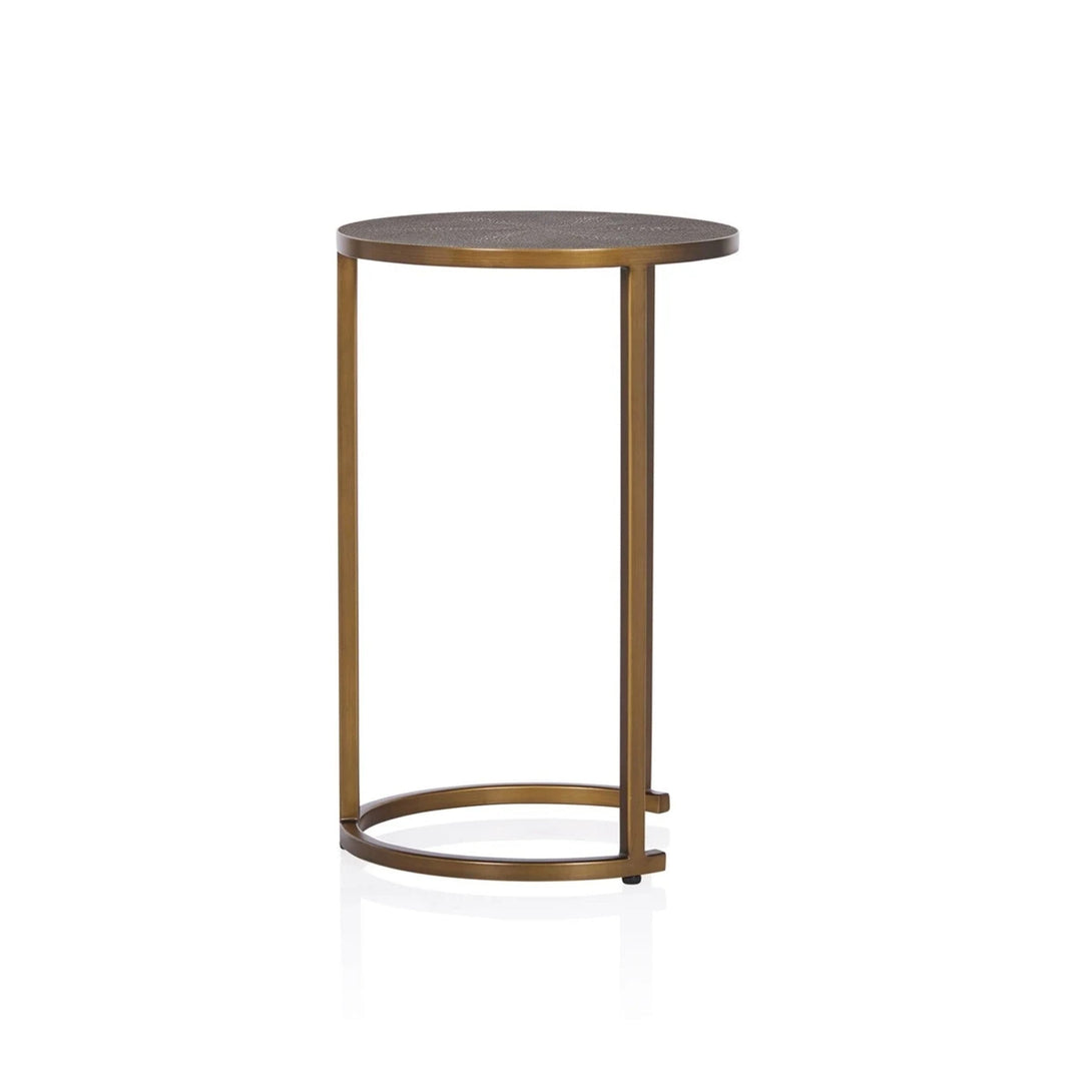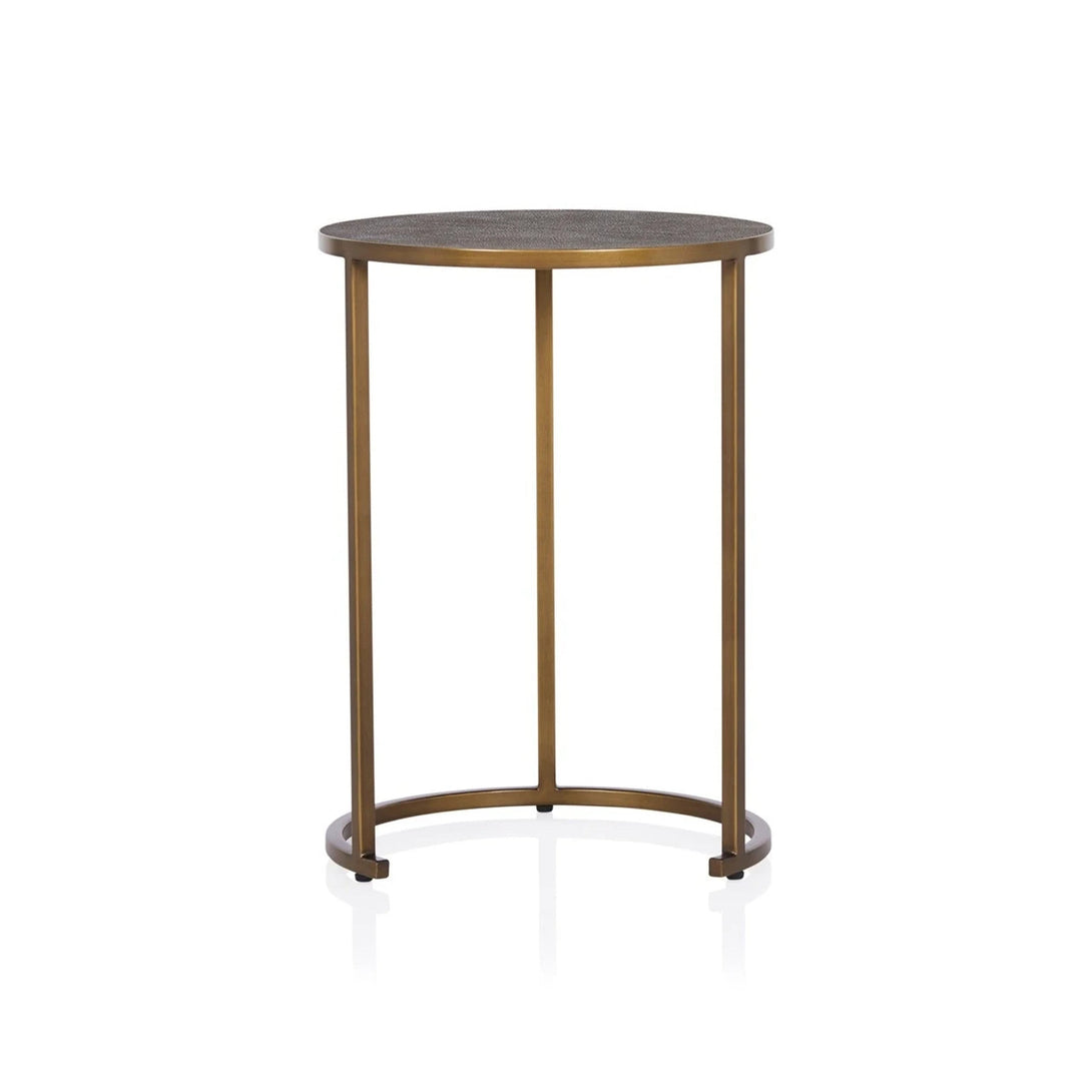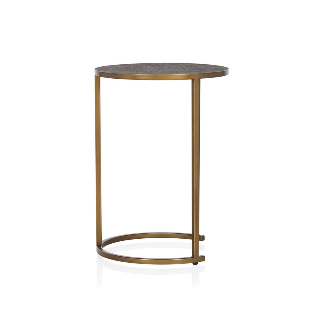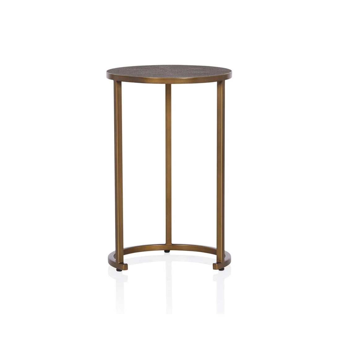 Sophisticated desk for the refined interior finished in a luxe combination of faux shagreen and polished stainless steel.|The Knox Nesting Side Tables are the perfect piece for adding a touch of glamour and function to your living room. The open and minimal design offer versatility while celebrating luxe materials. Featuring a diminutive metal frame with slender silhouette finished in antique brass accented by faux shagreen it is sure to amp the glam factor in any room. Sold together as a pair.