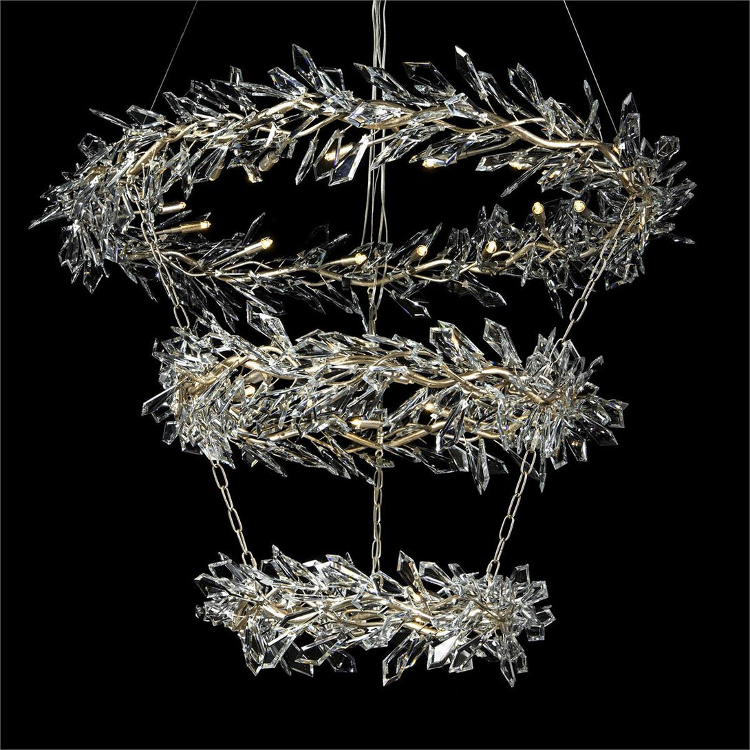 A stunning thirty-four–light pendant chandelier in antique silver leaf, designed with three halo tiers of hand-cut crystals. The layered rings create a dazzling cascade of light, making it an extraordinary focal point for grand interiors.