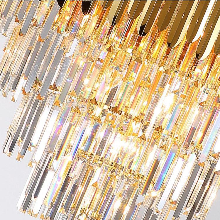This modern Kubica-style chandelier is beautiful and will elevate the look of your foyer. Available in multiple sizes. This chandelier boasts gold detail and an abundance of crystals that shine when reflecting the glow from the LED bulbs. |