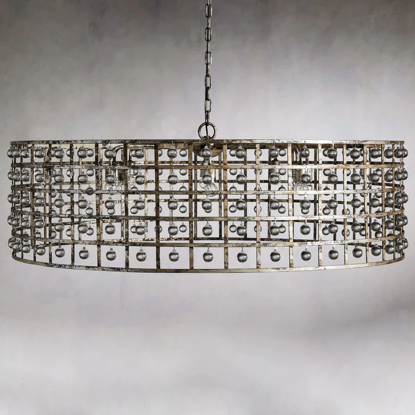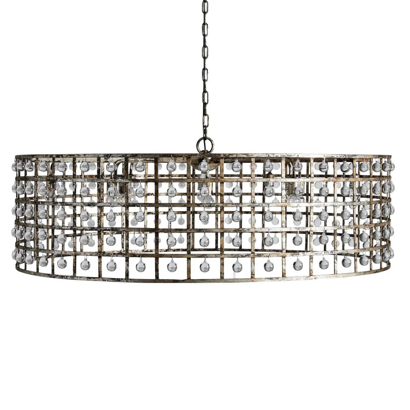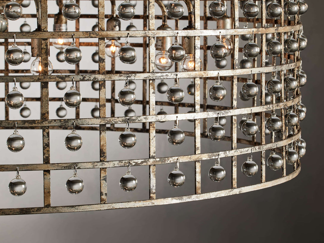 - Iron cage frame features an antiqued metallic finish complemented by Italian crystal spheres.