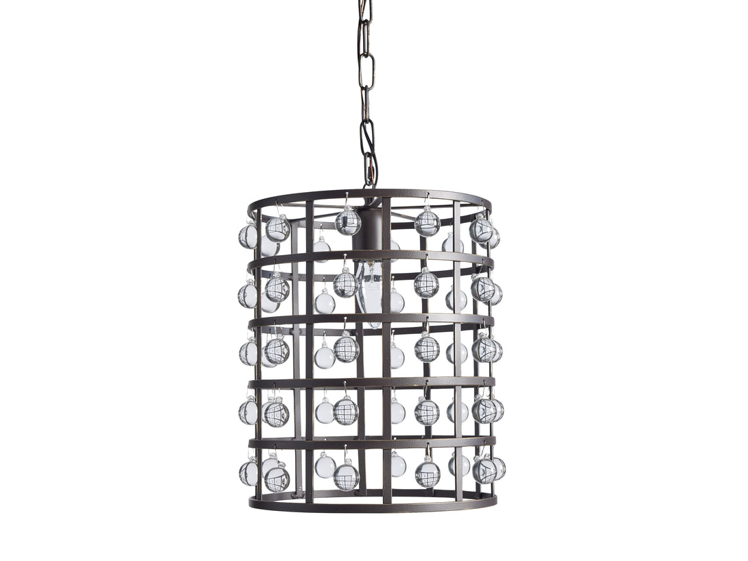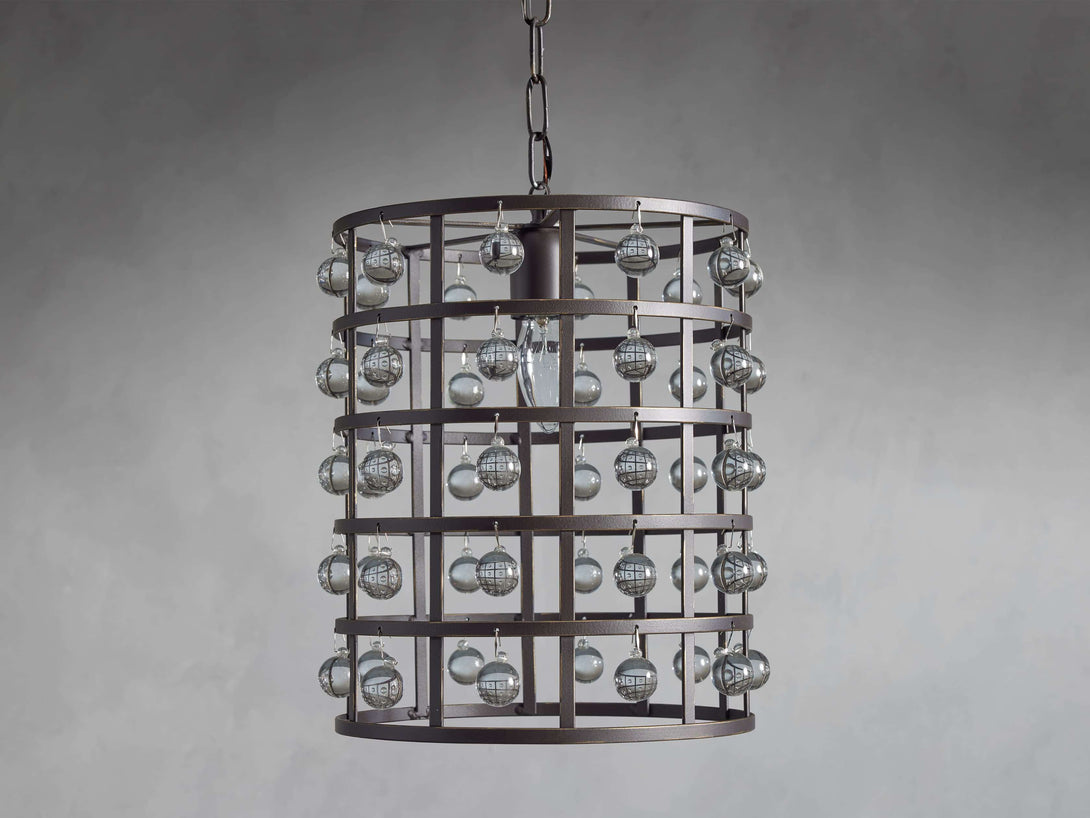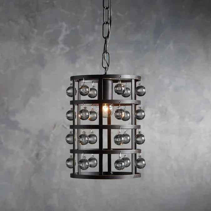 - Iron cage frame features an antiqued metallic finish complemented by Italian crystal spheres.