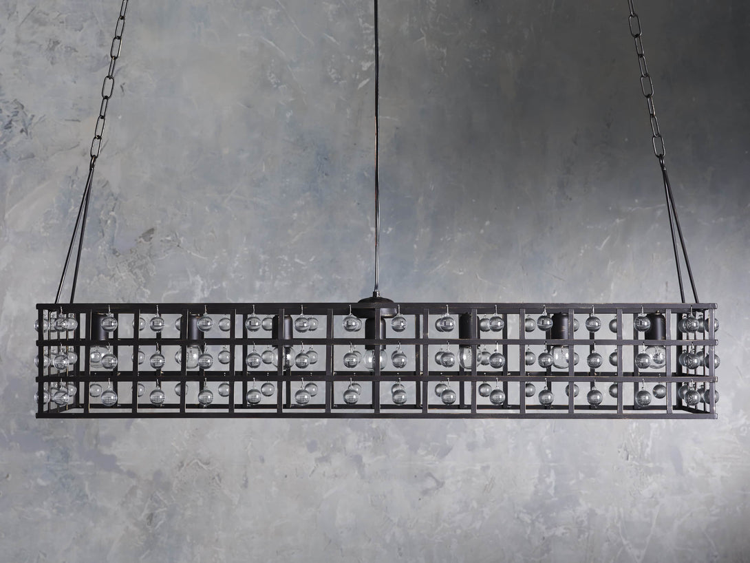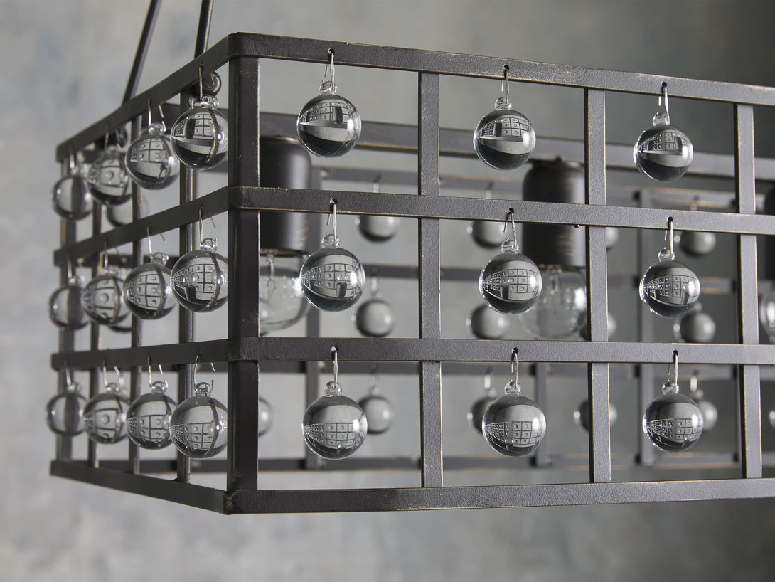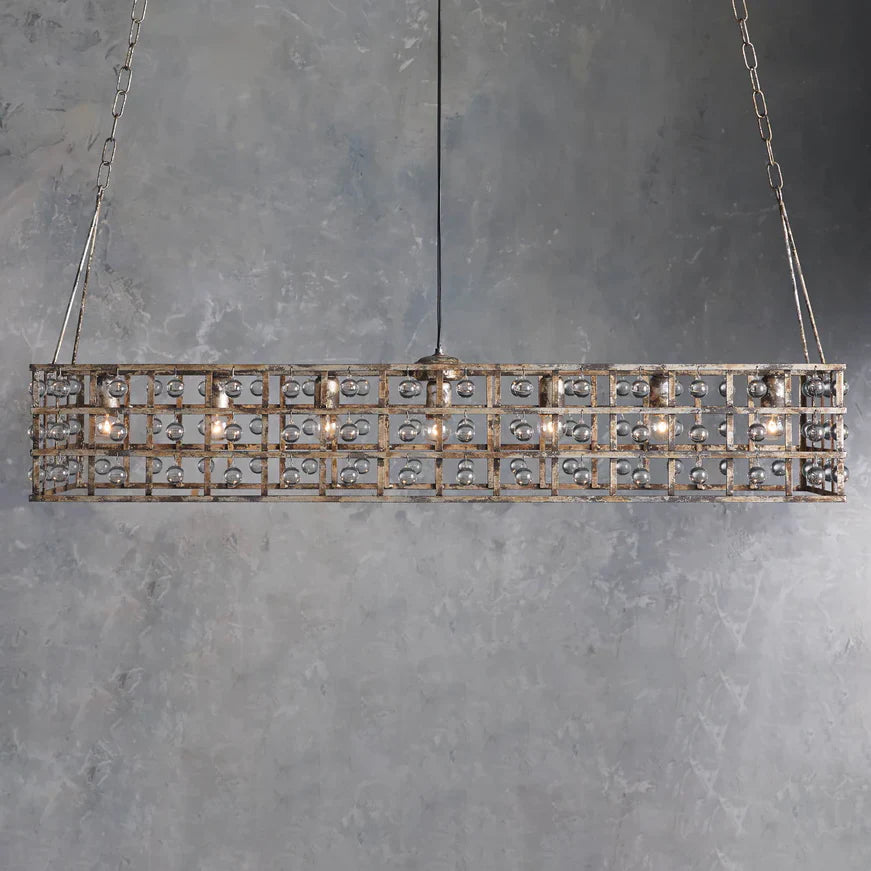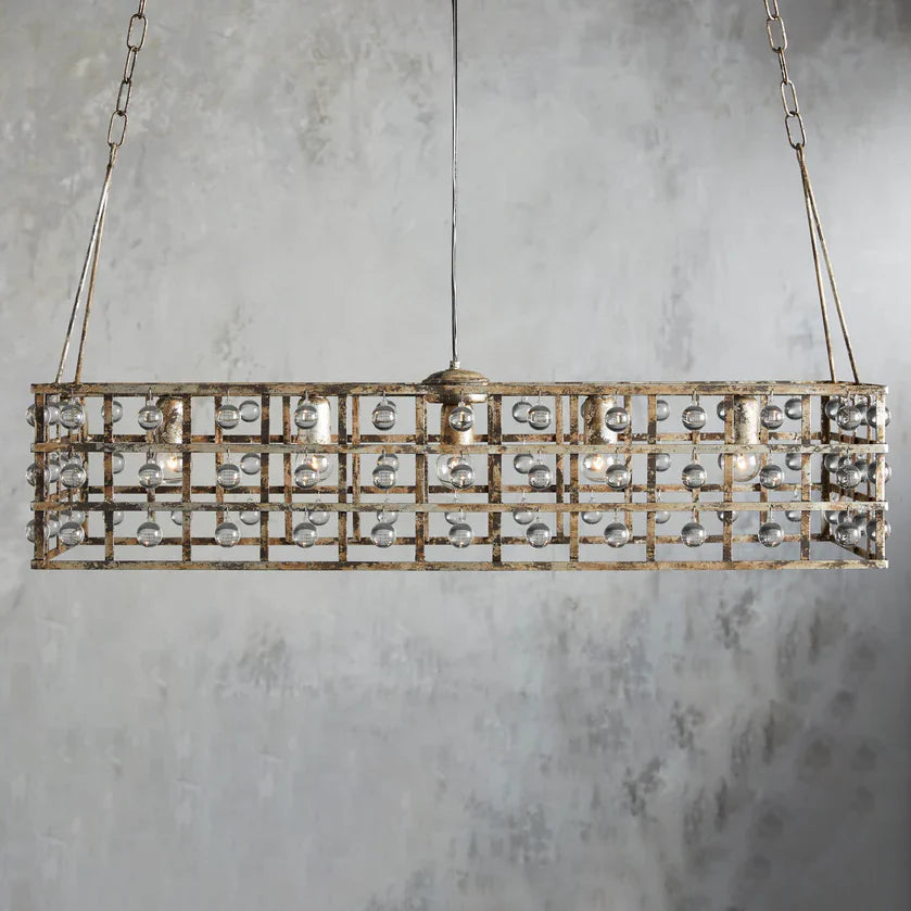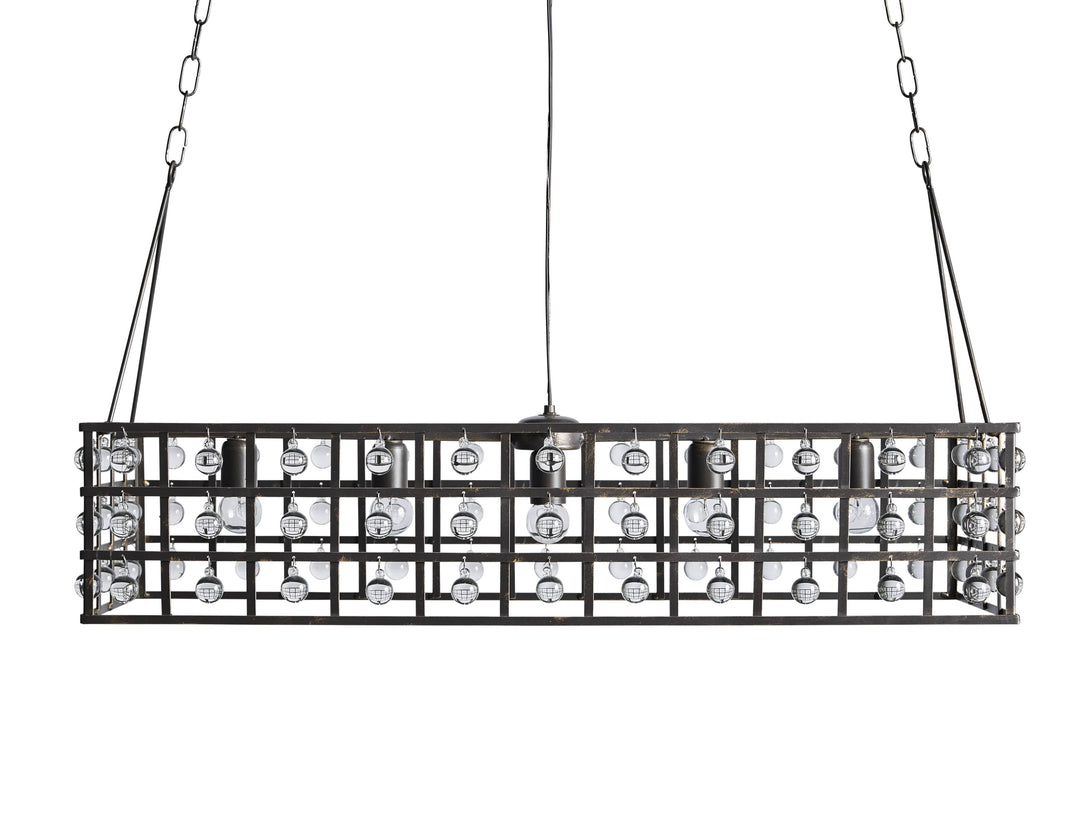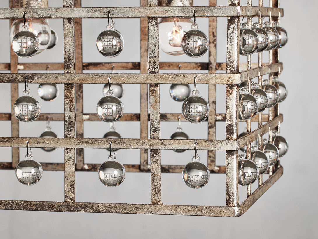 - Iron cage frame features an antiqued metallic finish complemented by Italian crystal spheres.
