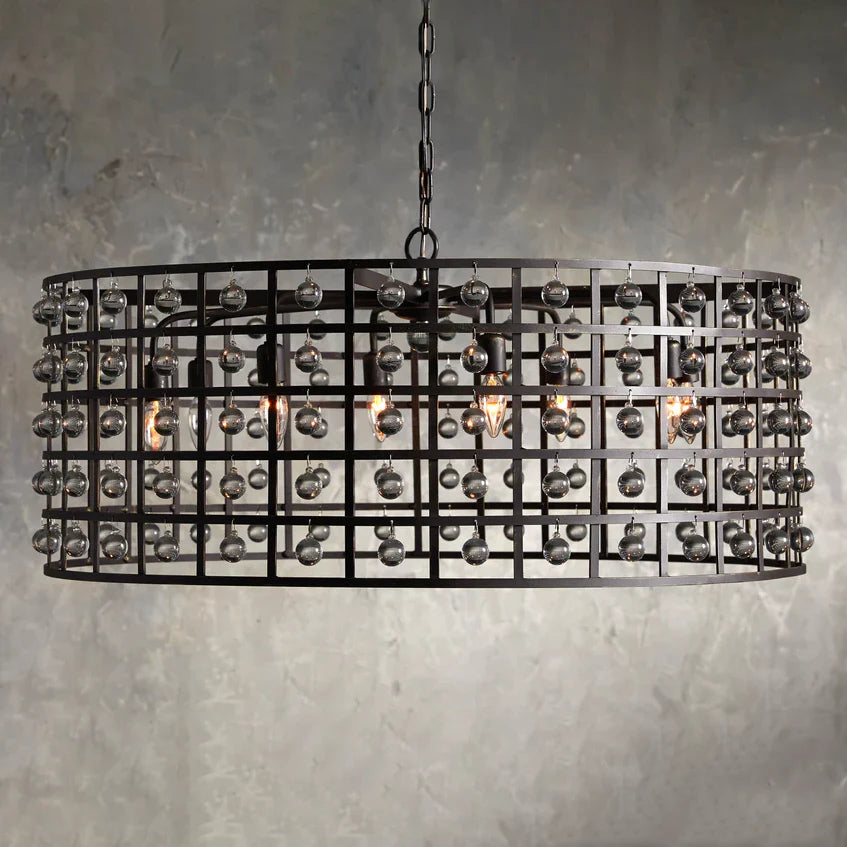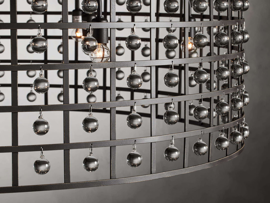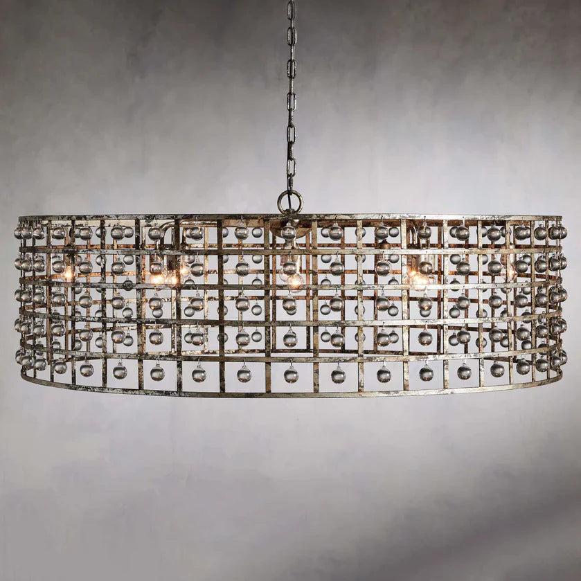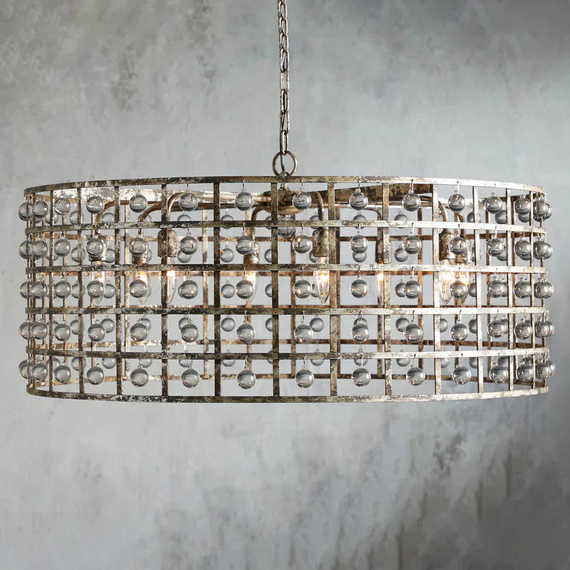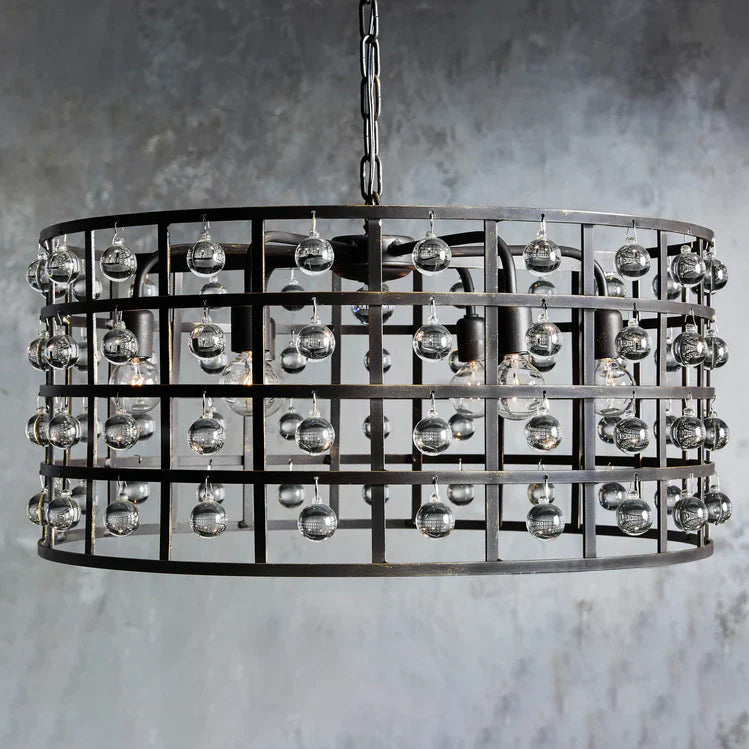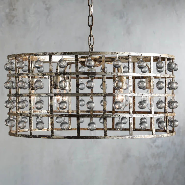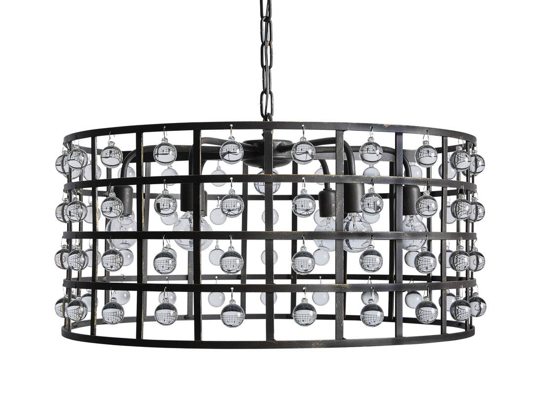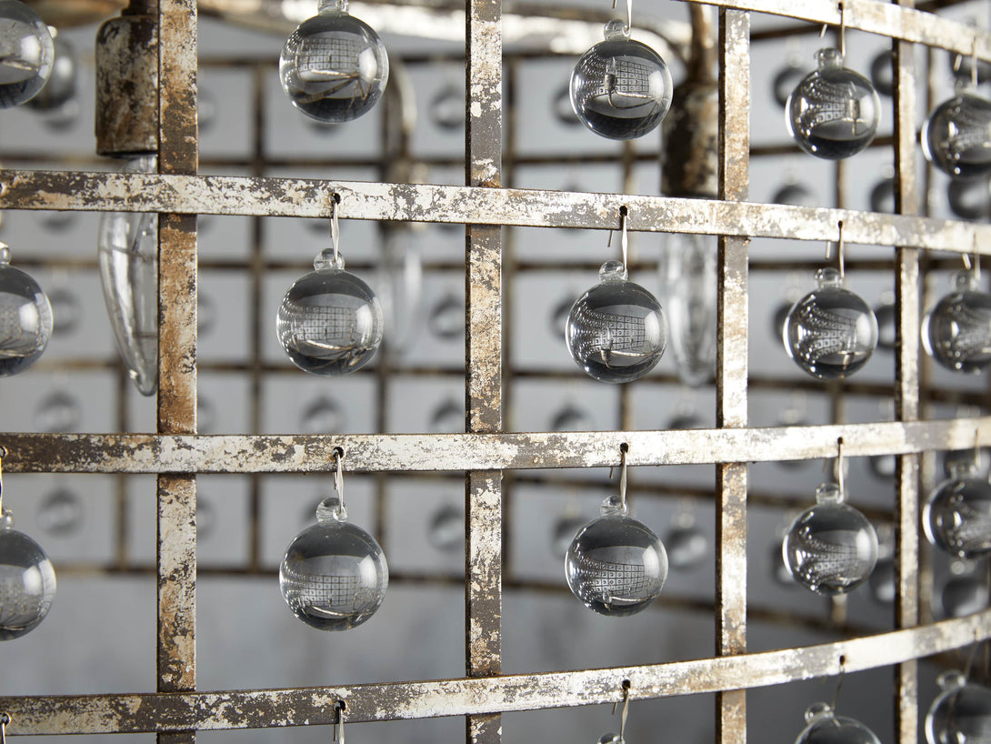 - Iron cage frame features an antiqued metallic finish complemented by Italian crystal spheres.
