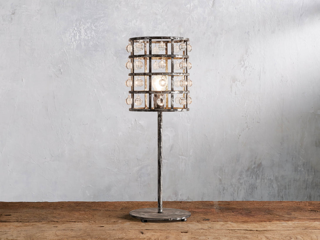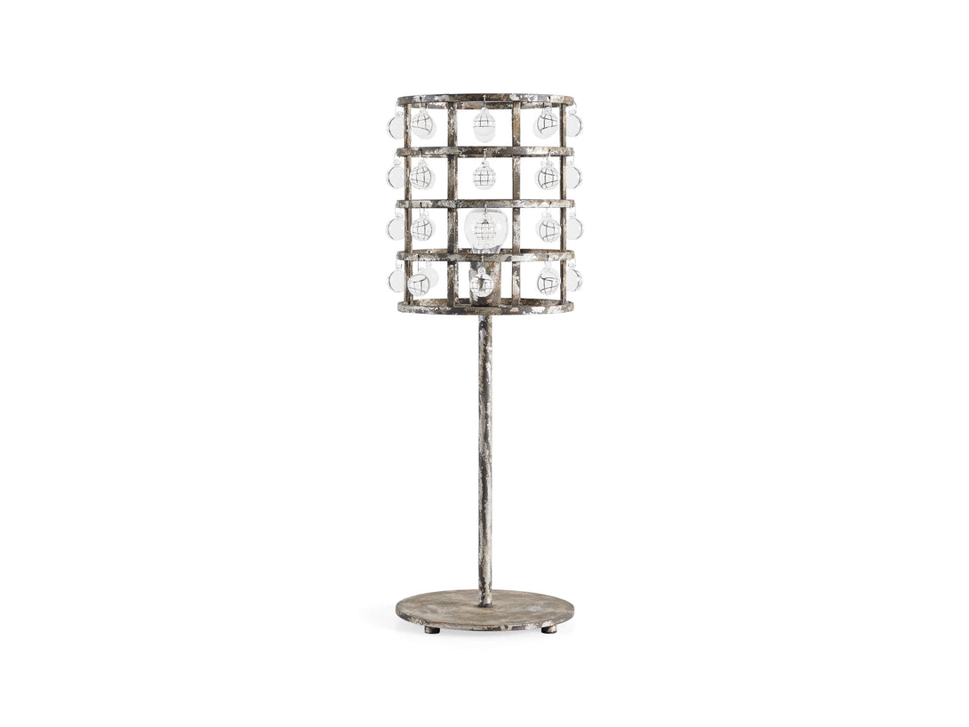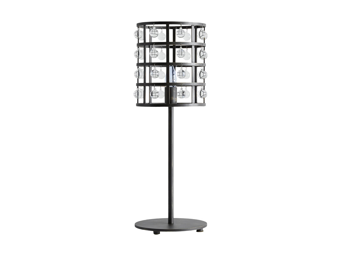 - Iron cage frame features an antiqued metallic finish complemented by Italian crystal spheres.