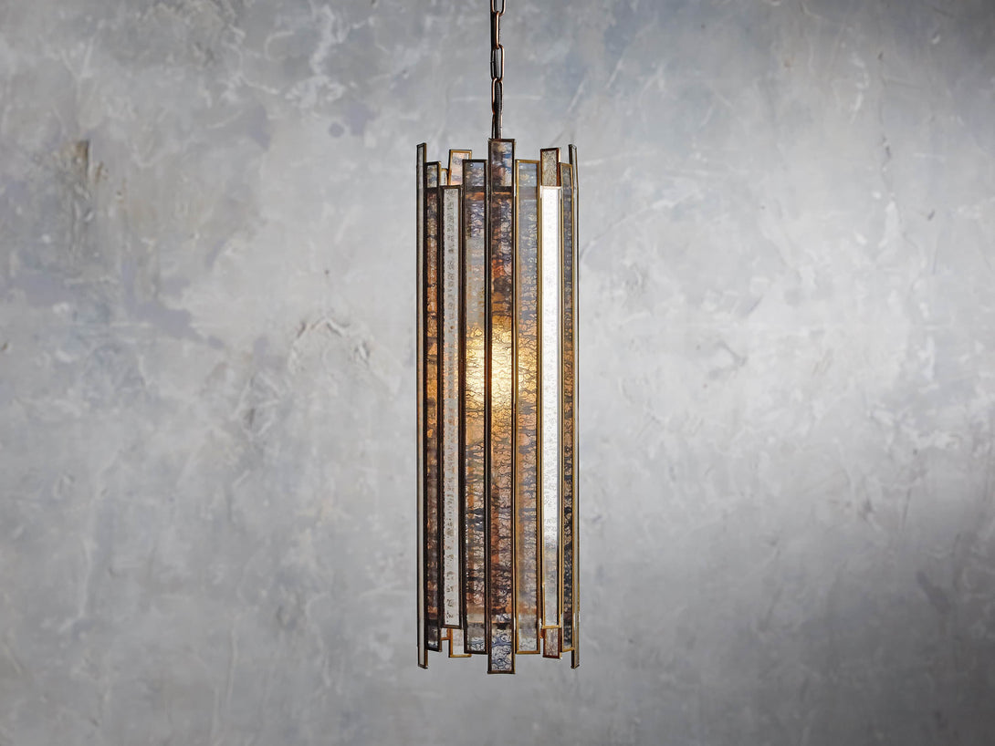 - Crafted from iron and brass with an Antique Copper finish with antiqued mirrored-glass panes surrounding the frame.