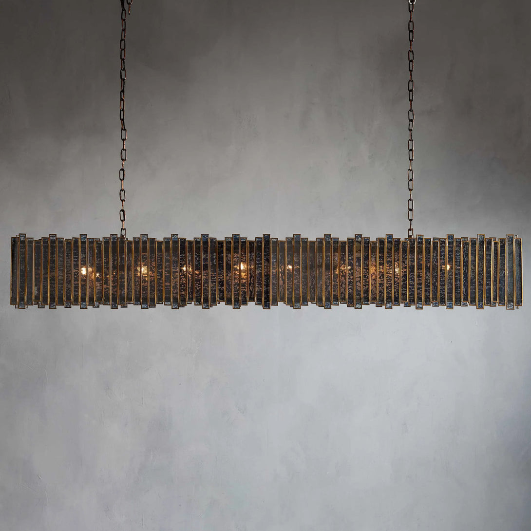 - Crafted from iron and brass with an Antique Copper finish with antiqued mirrored-glass panes surrounding the frame.