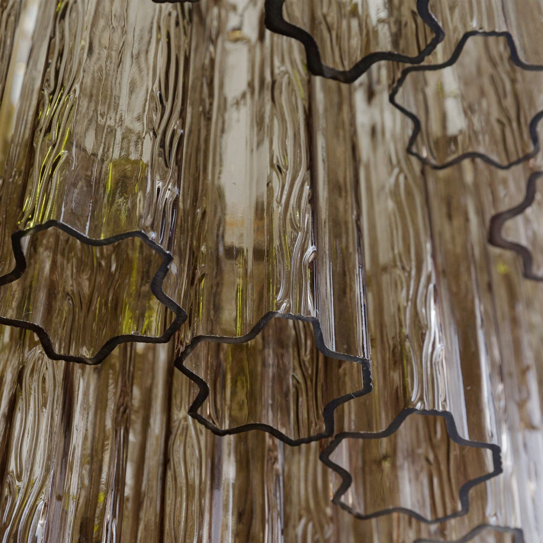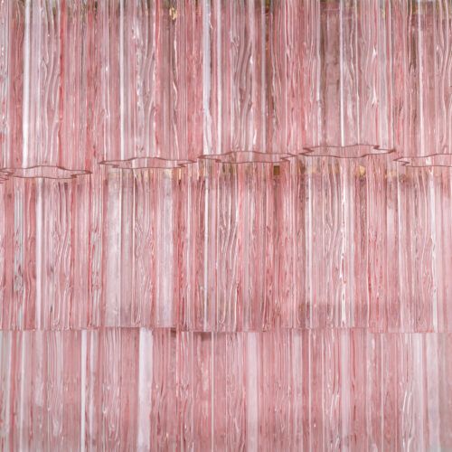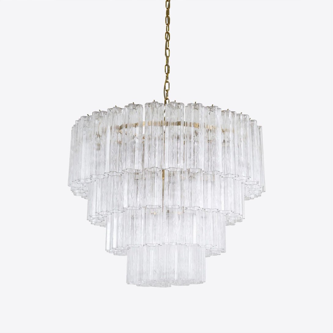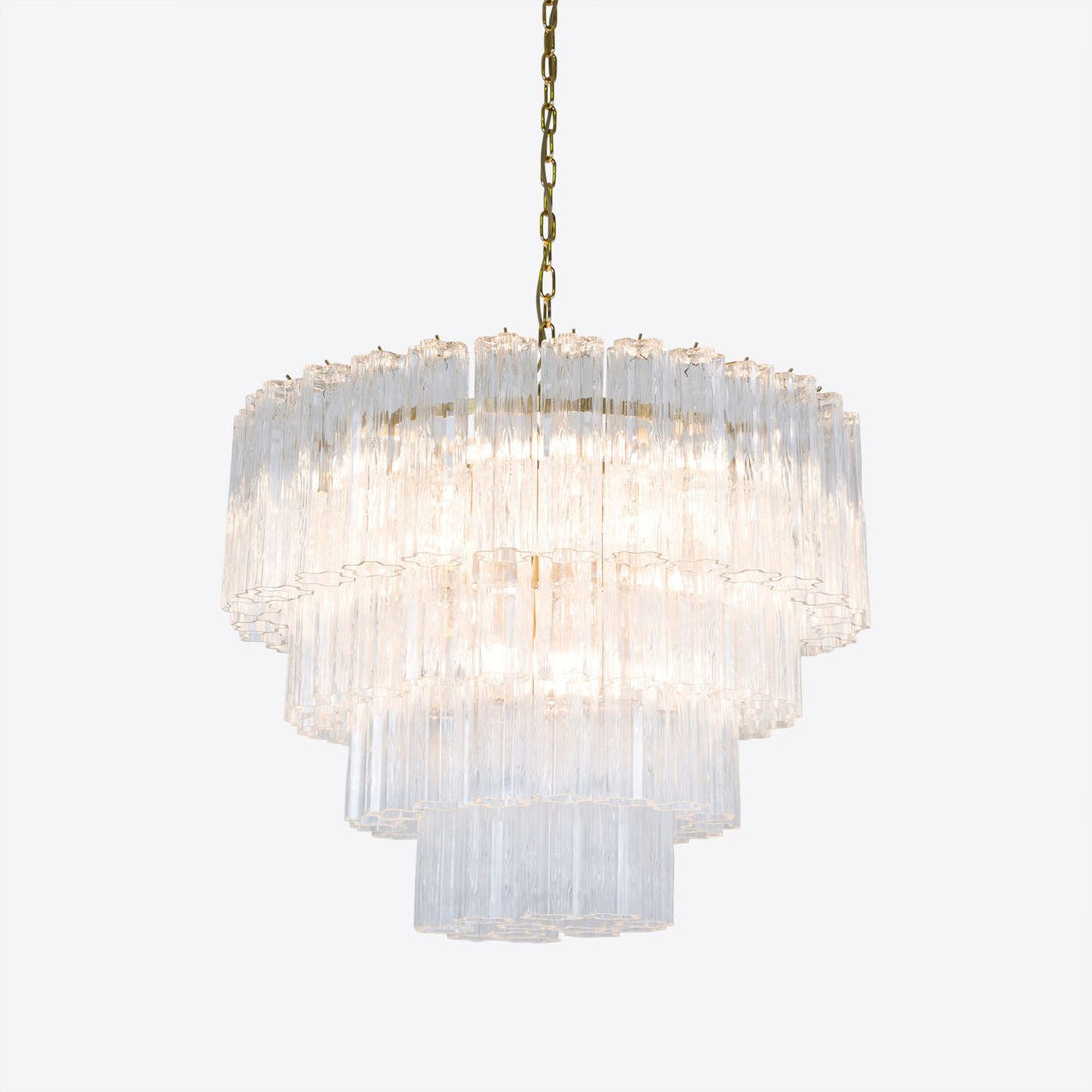 Four tiers of fluted glass tubes create this beautiful mid-century inspired chandelier. The textured glass tubes are individually hung from a Satin Brass frame. This style is available in three colours; a rich, sophisticated Smoked Quartz, a fresh blush Pink or clear glass.
