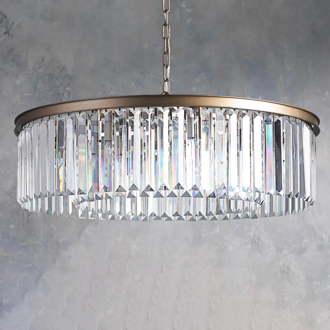 - French Art Deco style of the 1920s is reborn in our glamorous Leyland Lighting Collection, featuring a row of faceted glass crystals hanging from a rustic iron frame.
