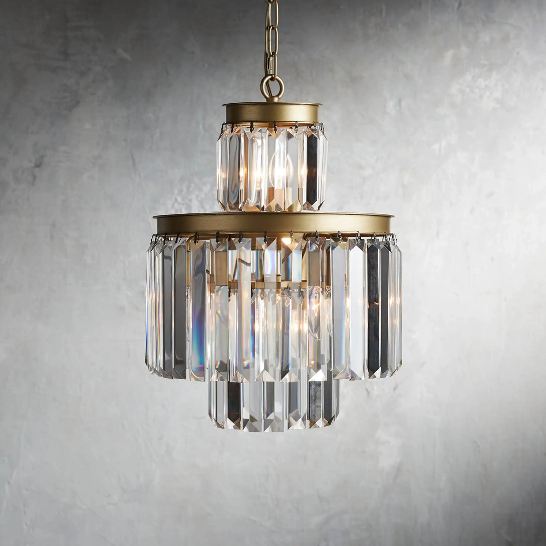 - French Art Deco style of the 1920s is reborn in our glamorous Leyland Lighting Collection, featuring layered row upon row of faceted glass crystals from a rustic iron frame.