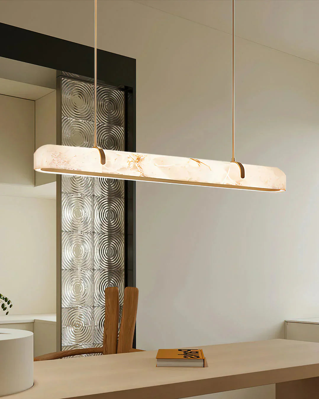 Enhance the atmosphere with our Linear Alabaster Chandelier. Perfect for creating an airy sheen, this hanging light provides a dreamy ambience. With LED lighting, it effortlessly floats in the air, reminiscent of a soft cotton cloud drifting to the sky.
