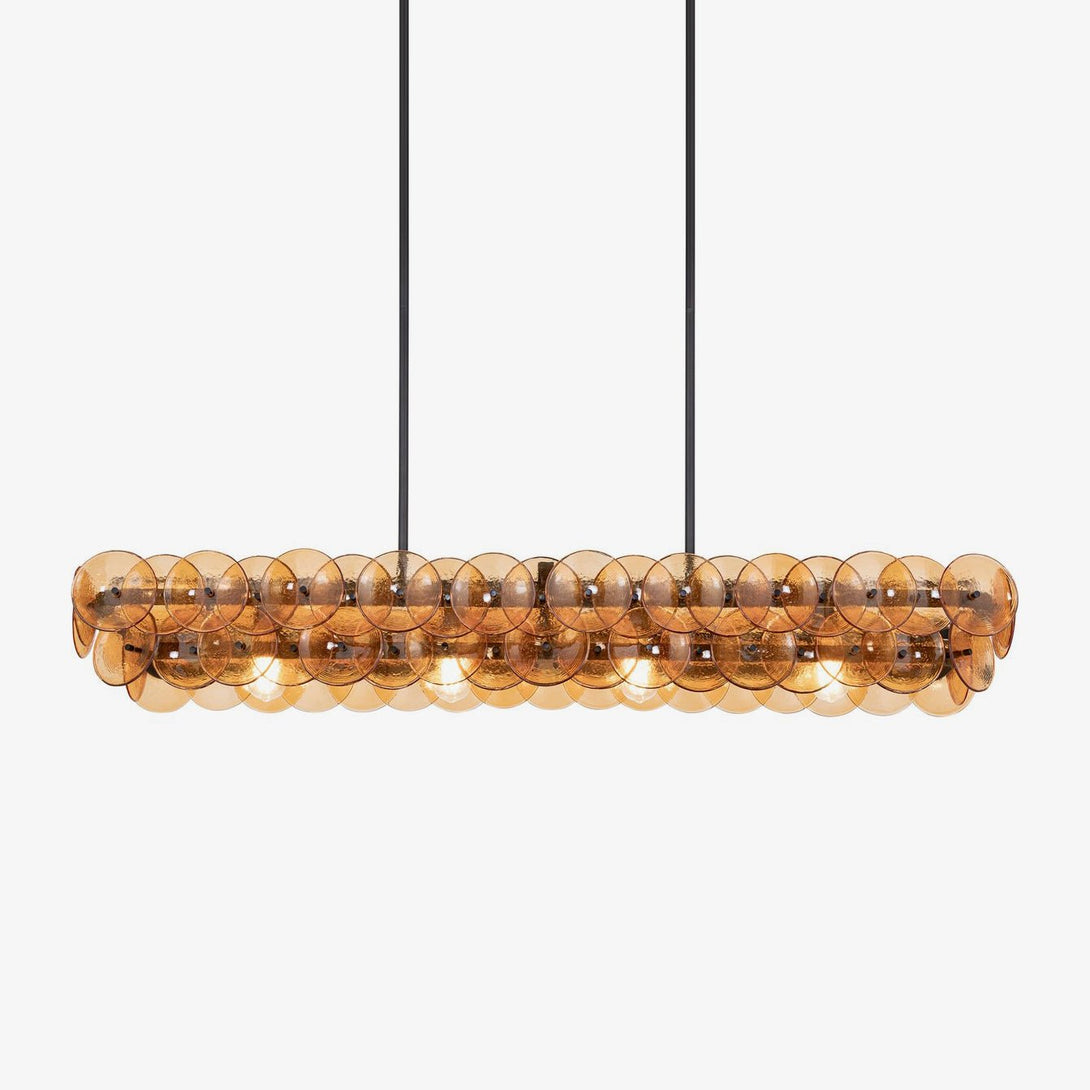 The Loren Linear Chandelier features overlapping handmade pressed glass disks set within metal frames inspired by Mid-Century Italian design. Available in Textured Clear or Vintage Green glass on a Weathered Brass frame, or Amber glass on a Gunmetal frame, the textured glass diffuses light to create a warm, inviting glow. Its elegant round or linear configurations make it an ideal centerpiece for dining areas or living spaces, combining sophisticated craftsmanship with functional ambient lighting.