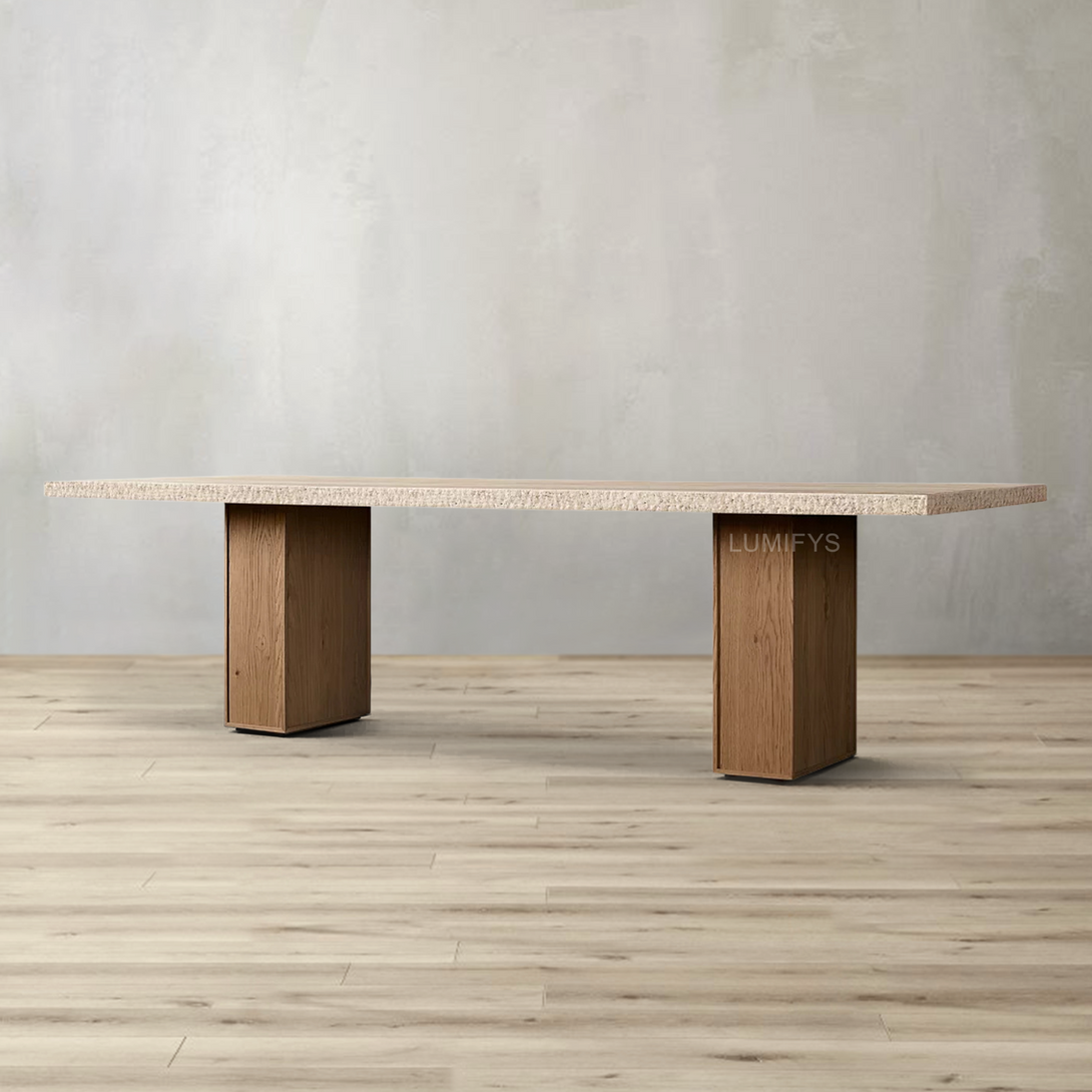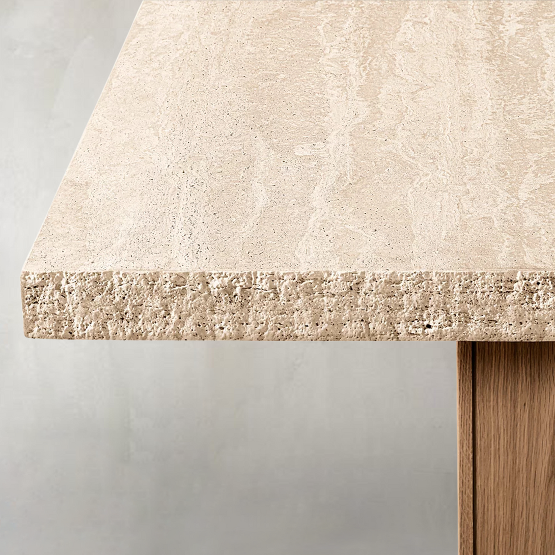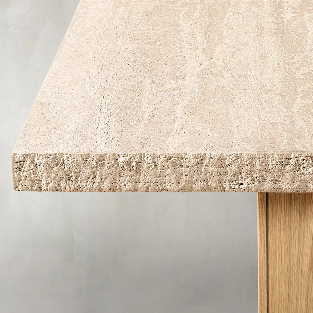 - Tabletop is crafted of ¾"-thick Turkish travertine over an engineered wood core
