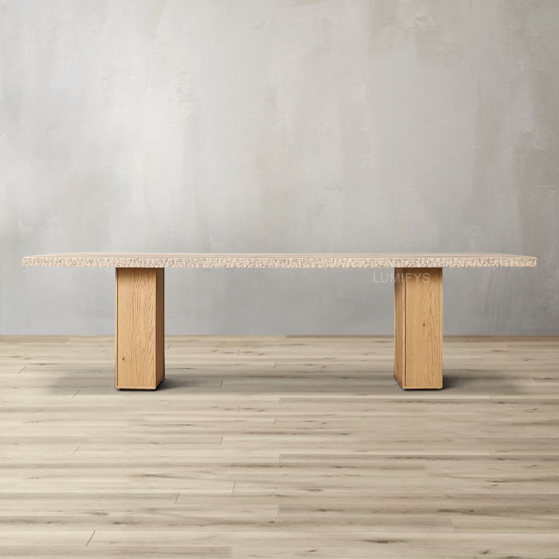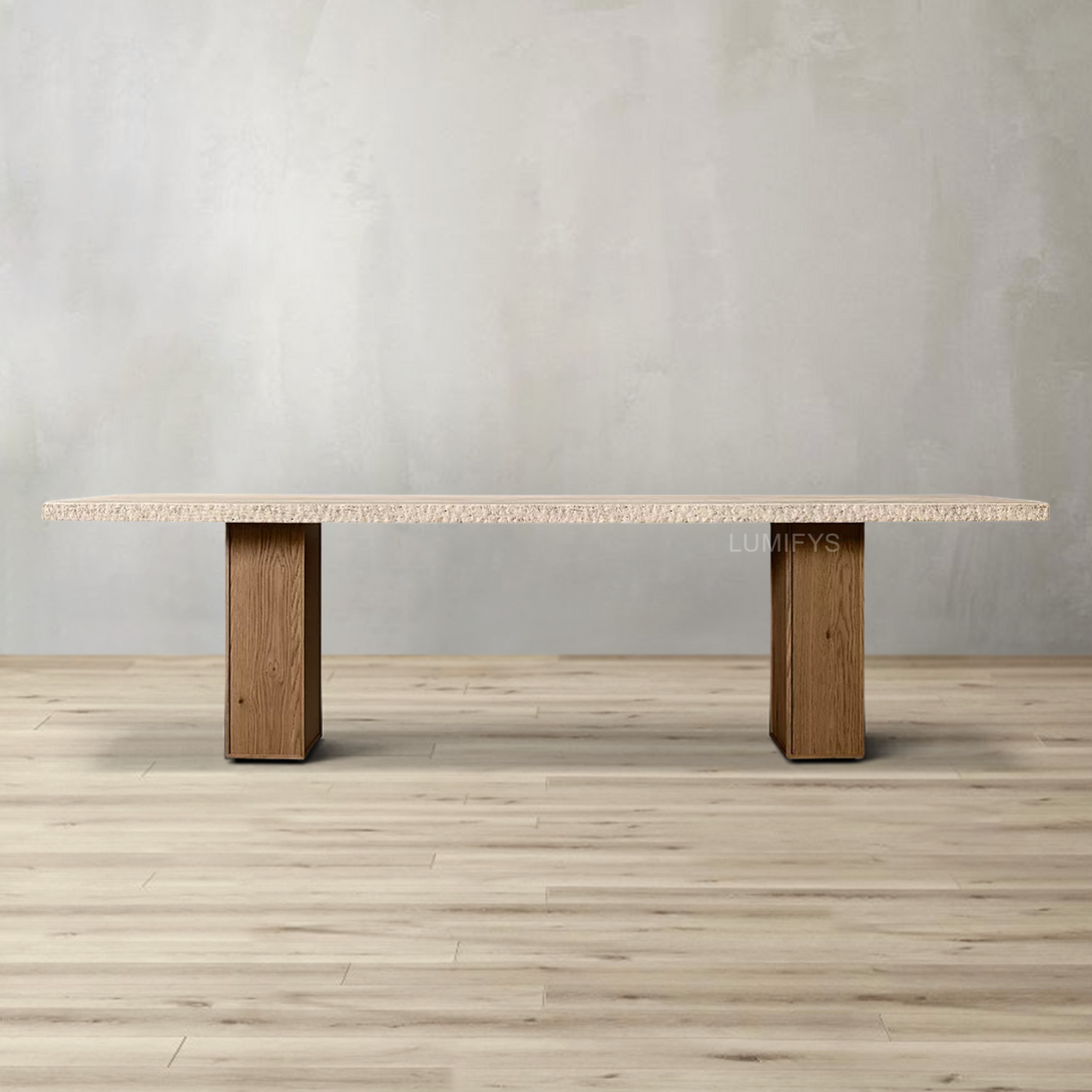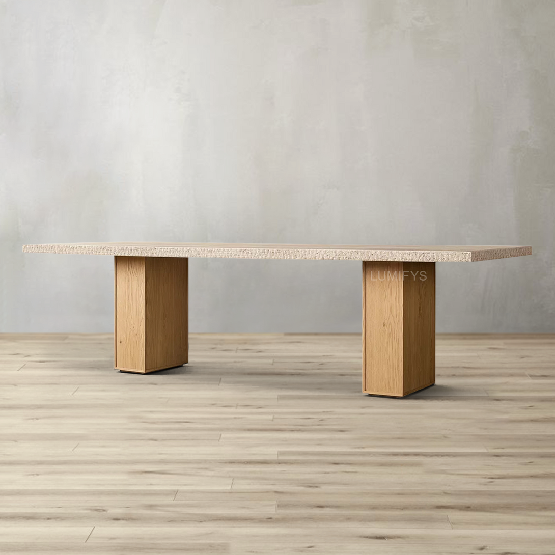 - Tabletop is crafted of ¾"-thick Turkish travertine over an engineered wood core