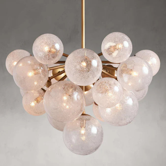 - A fusion of rustic charm and industrial design, our Mandoza Collection features stunning silhouettes and mixed-material style. Each individual glass globe is hand-blown with a reactive technique, creating a dense network of bubbles under a thick layer of glass. The result has a striking effect when illuminated from within, casting light from every angle.