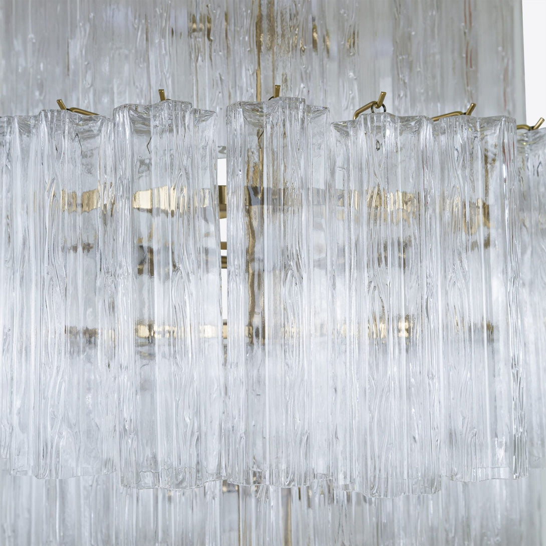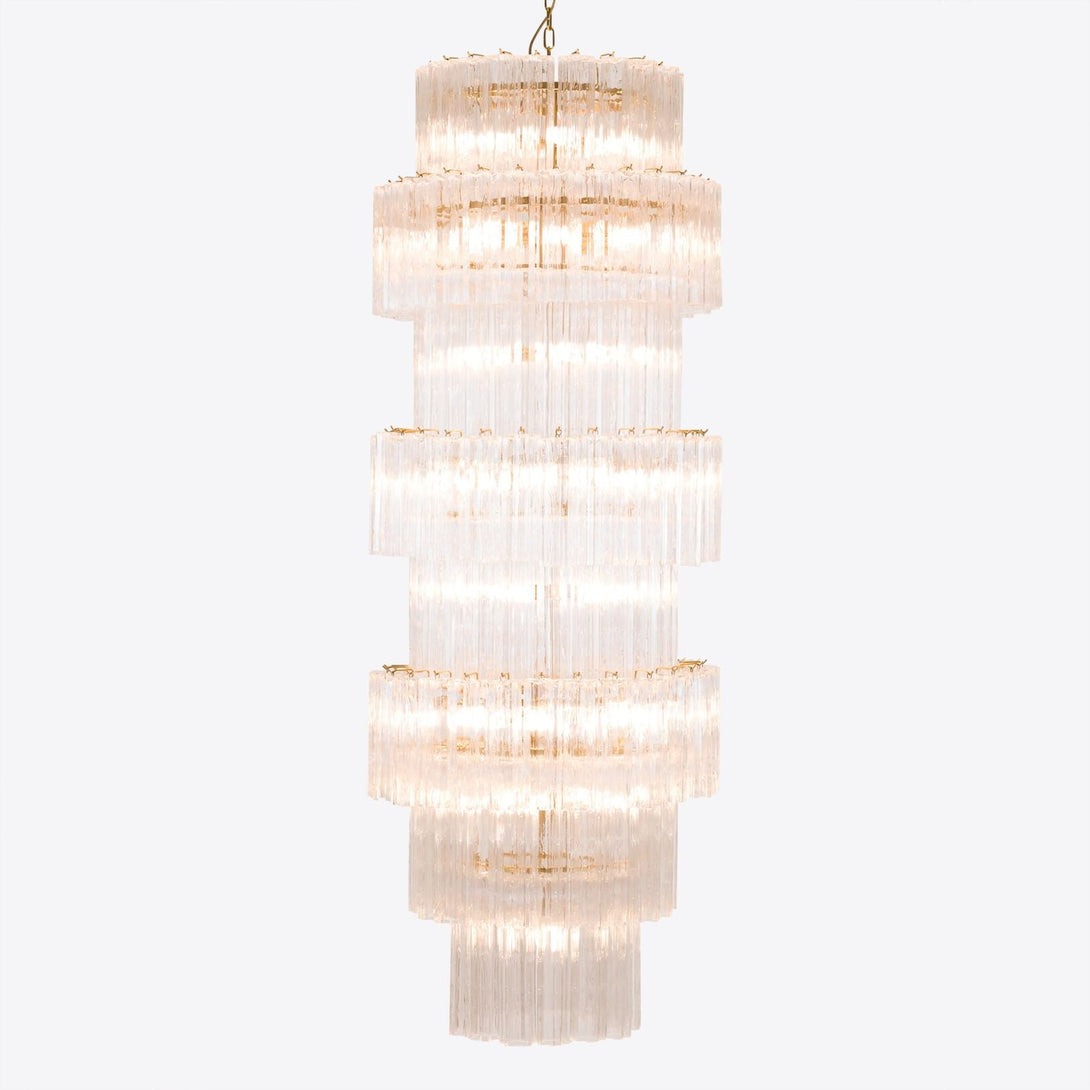 Eight amazing layers of clear glass tubes create this breathtaking tiered stairwell chandelier. Each tube of textured glass is individually hung from the Satin Brass frame.
