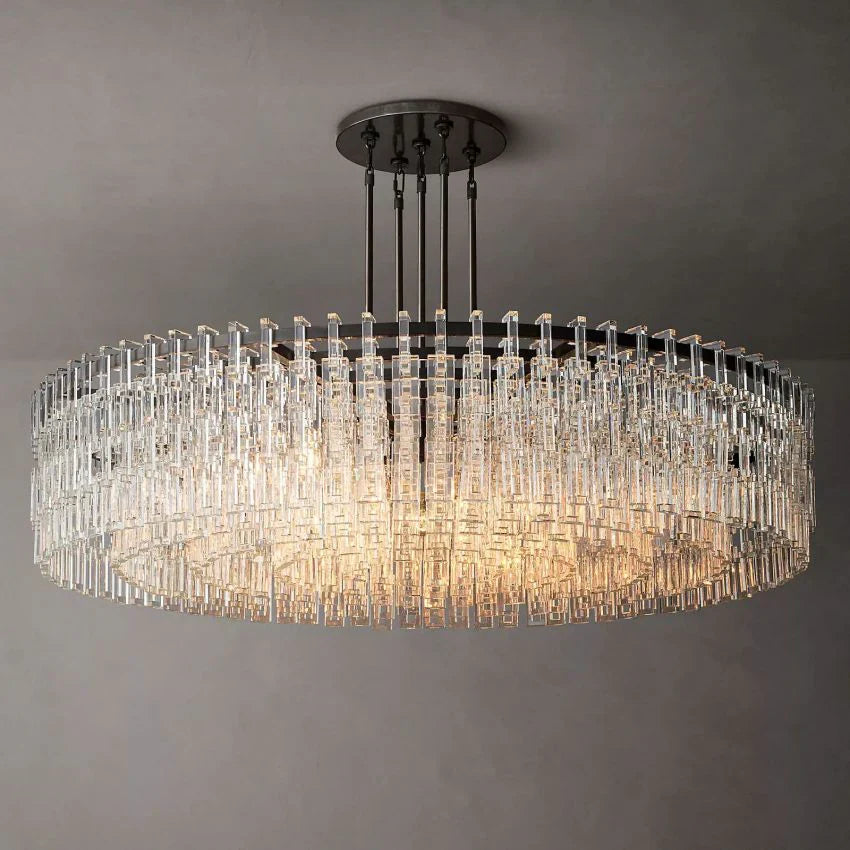 The chandelier is made of sand cast brass and K9 glass, a crystal used to make optical lenses and prisms. Connected with the O-shaped crystal. Inspired by industrial metal chains, it reimagines staggered open and closed links with amazing crystal glass. The pure, simple and stylized chain link is made of more than 600 crystals without wire suspension, creating a bright cascade and shining light.