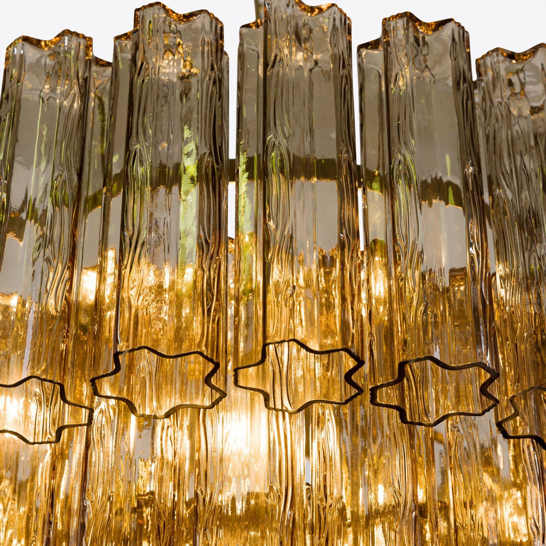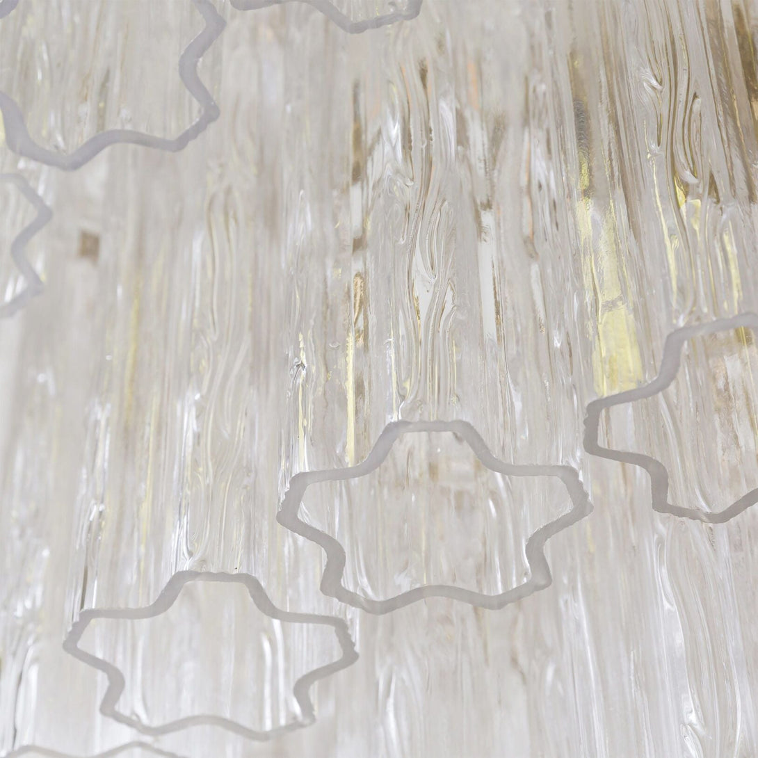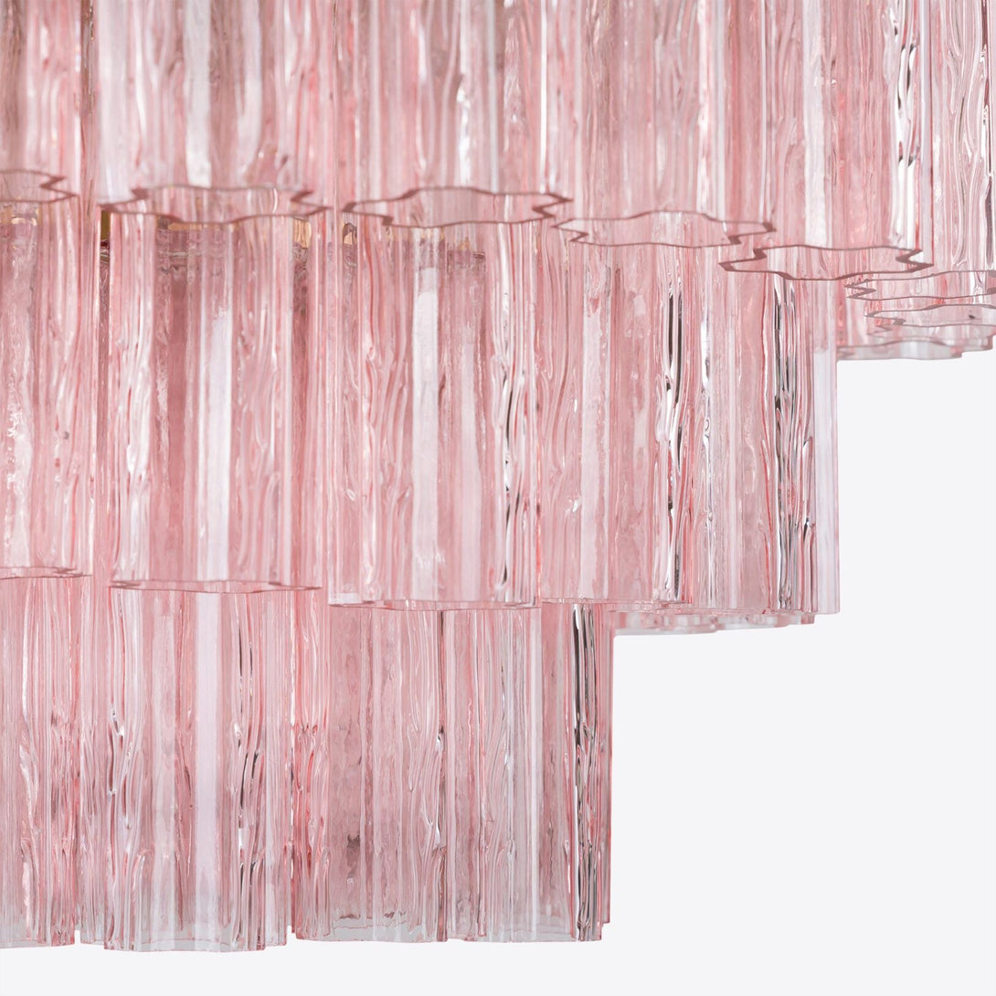 Three tiers of fluted glass tubes create this beautiful mid-century inspired chandelier. The textured glass tubes are individually hung from a Satin Brass frame. This style is available in three colours; a rich, sophisticated Smoked Quartz, a fresh blush Pink or clear glass.