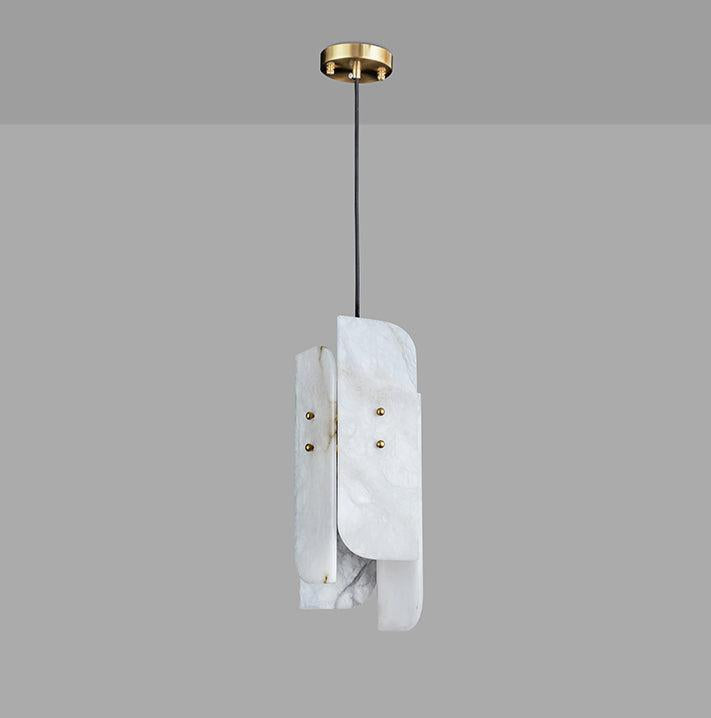 The Megalith Mini Alabaster Pendant Light mimics crystalline formations found in nature. Hand-cutting alabaster shades are suspended from brass-plated airplane cables, delicate brass rods, and hand-shaped brass hardware.
