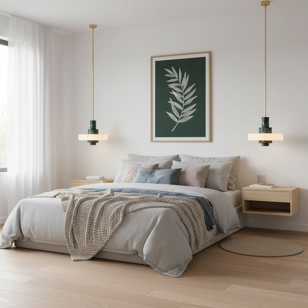 The Mercury Green Marble Pendant Lamp features a white glass shade gracefully suspended between solid green marble elements, accented with subtle brass detailing. Its open-bottom shade directs soft, ambient light downward, making it an elegant centerpiece for dining tables or kitchen islands. This lamp blends refined materials with thoughtful design to elevate your space with understated sophistication.