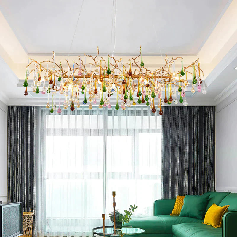 Like dewdrops under a forest canopy, the crystal chandelier displays glistening glass beads that cascade from organic leaves and branches. The soft and warm light emitted in the colorful crystals. Exciting and alive, the colorful droplets providing an alluring romantic sense, reminiscent of the beauty of nature.