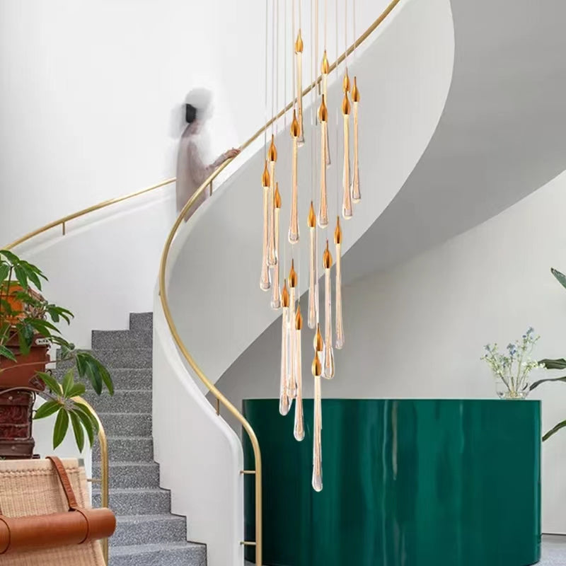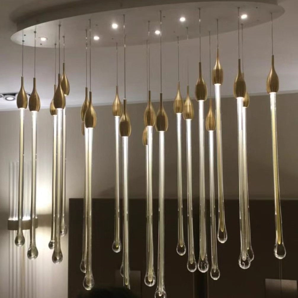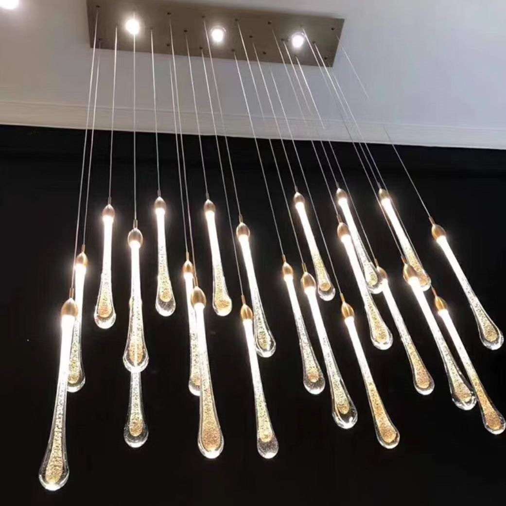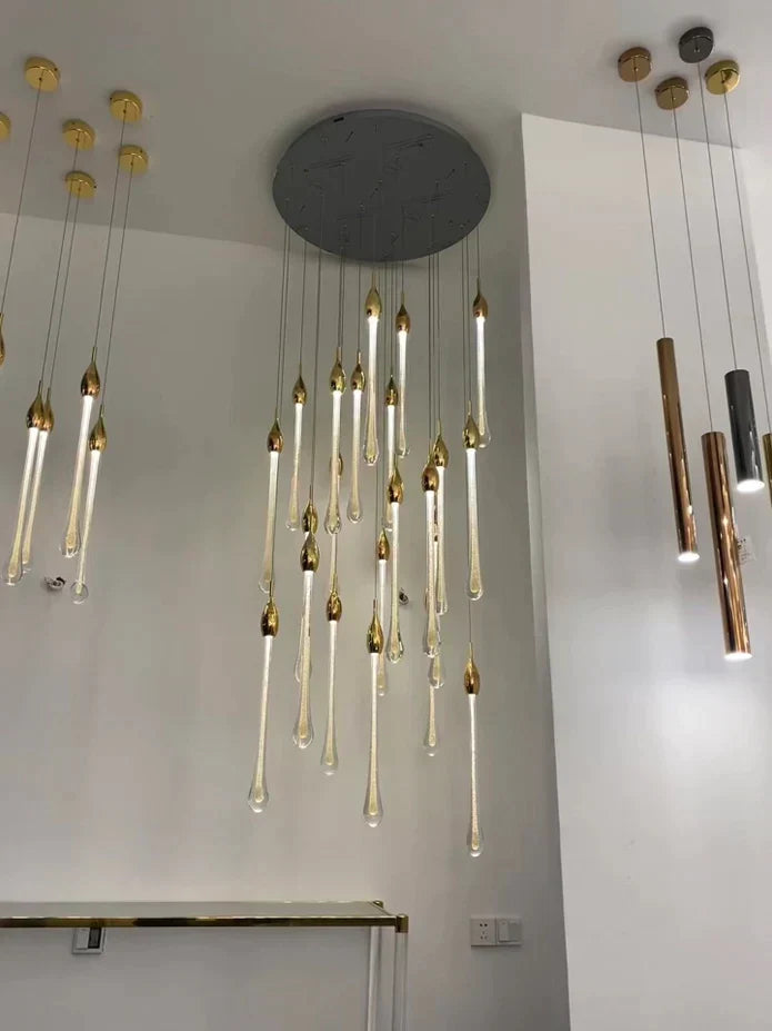 This chandelier combines classic and contemporary elements with eye-catching results,featuring brass frame trimmed with numerous long raindrops,offering a modern and warm atmosphere.Numerous golden wires are placed in the glass lampshades,adding another sense of luxury and modernism to itself.Two types for selection:round or rectangle sucken disk.Suitable for various application scenario,including staircase,loft,kitchen islandd,high-ceiling living room,walk-in closets,etc.