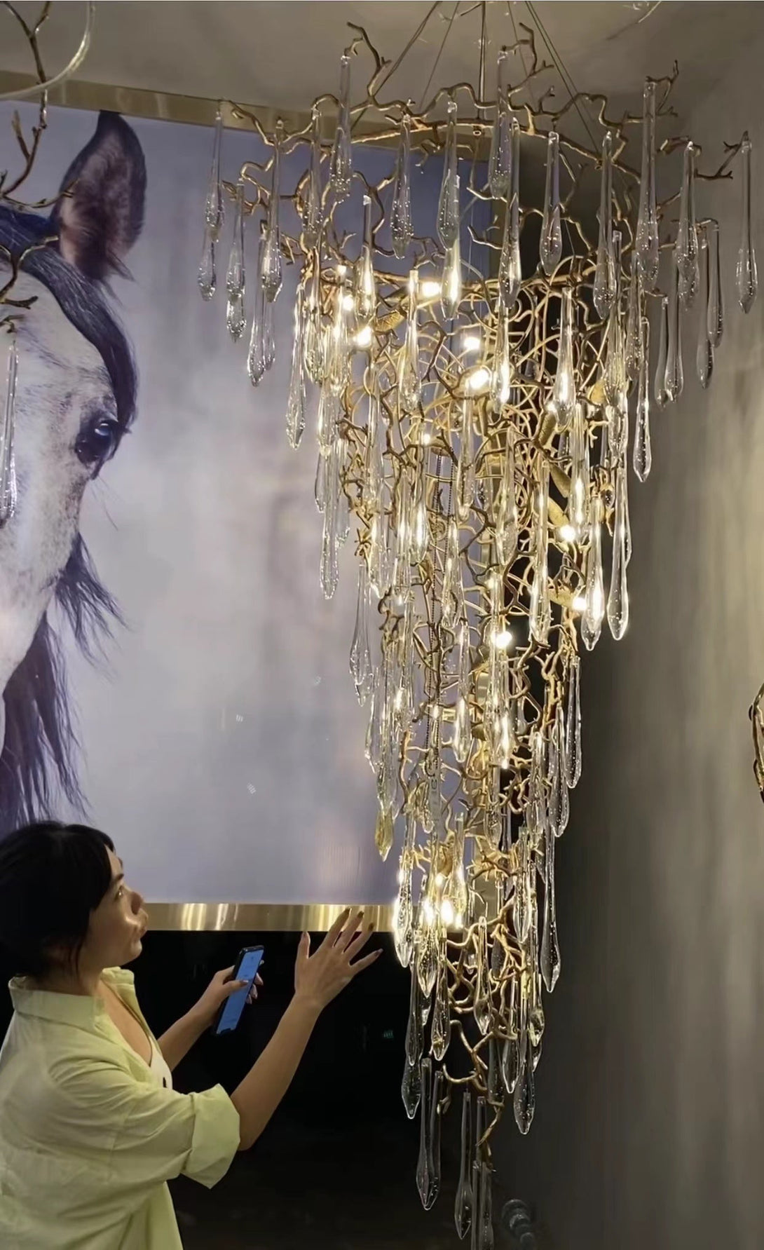 This crystal chandelier, uses clear light bubble droplet pendants, light effect refraction radiant, droplet bubble shape with a sense of design overlapping art, adding the vitality of space and a sense of art; with full copper branch shape, lamp branch modeling exquisite, natural and realistic, uniform force. The resonance of art and life is given to the artistic mood of the space through the concise lines.