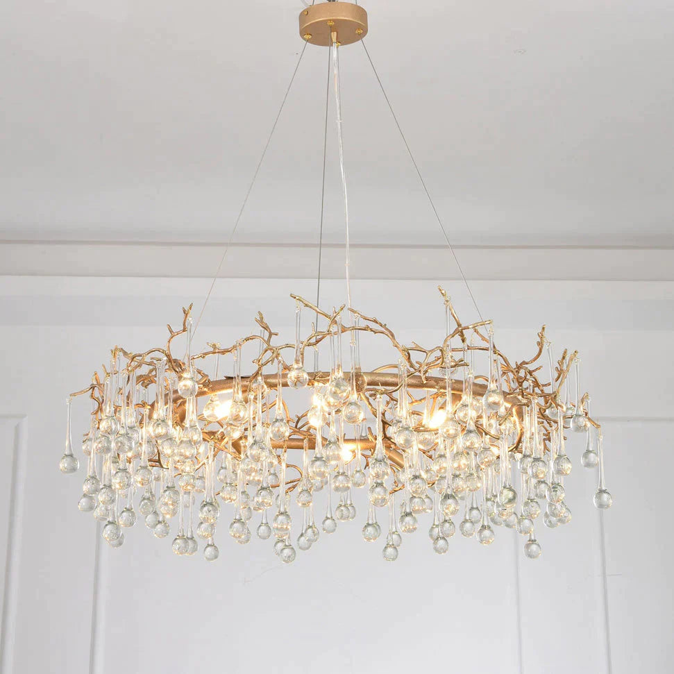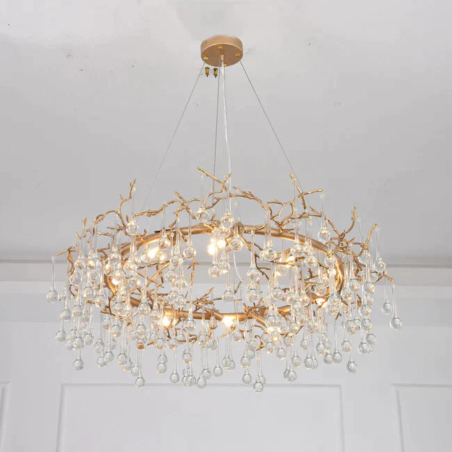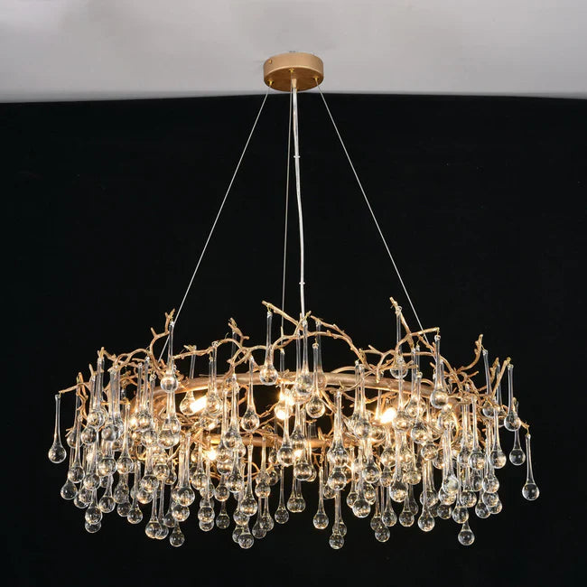The water drop chandelier is made of brass and glass drops, This artistic lighting fixture features a center area where life-like branches start to twist and turn from, covered with a luxurious brass finish. Multiple light bulbs provide the dramatics of light rays glistening through the crystal droplets.